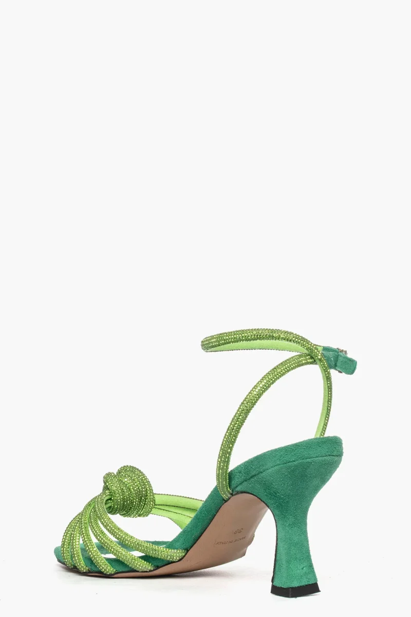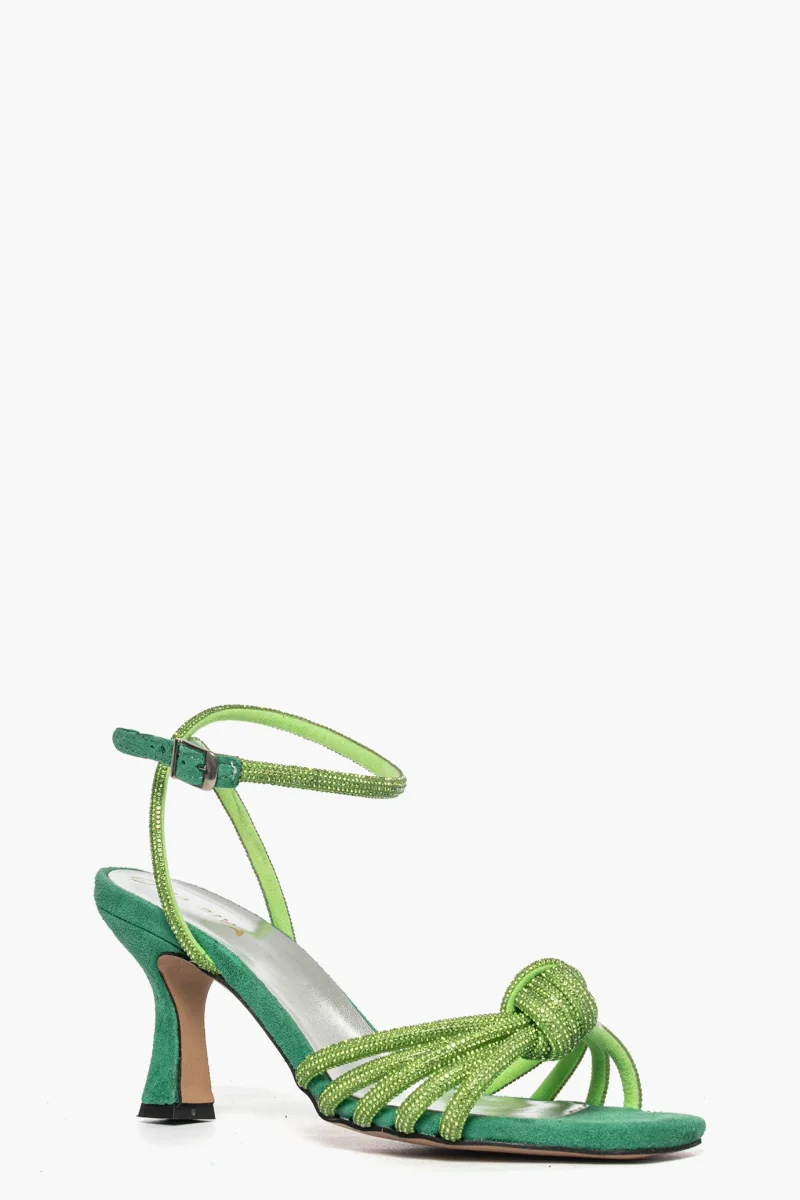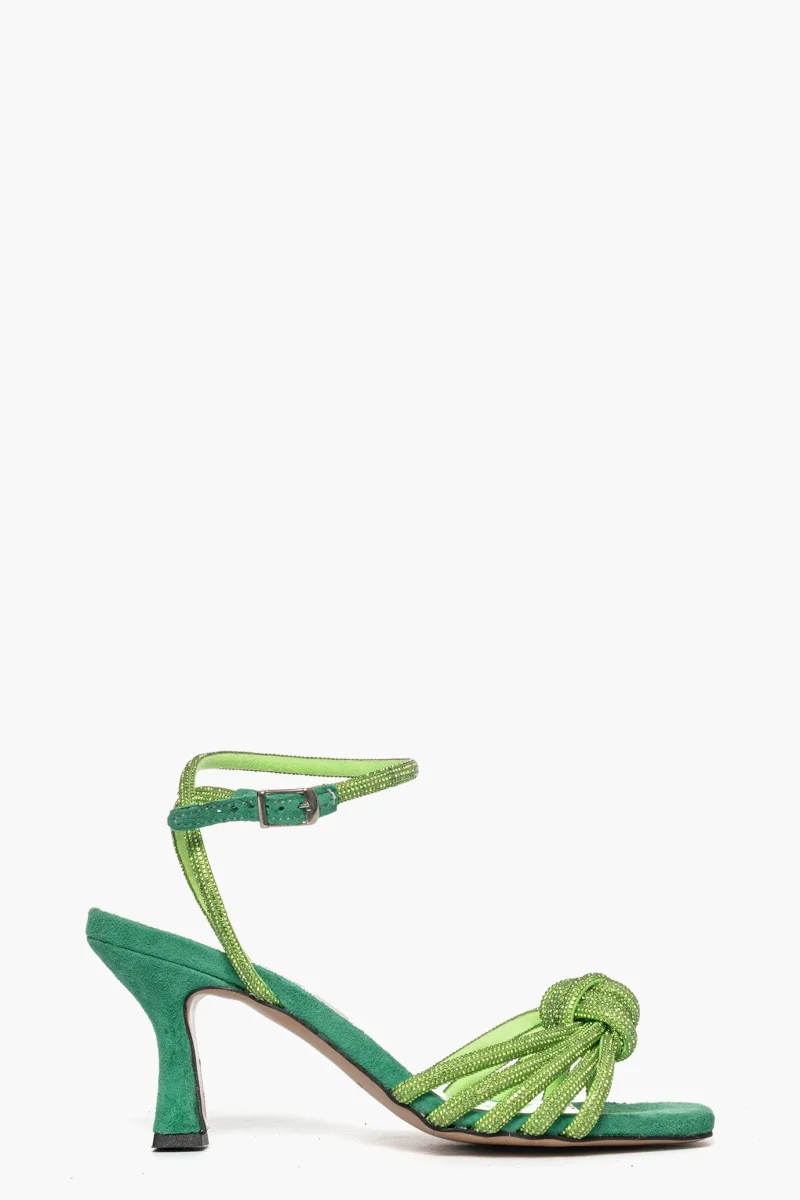 Sandali in camoscio verde e strass verde cinturino alla caviglia con strass verdee regolabile con fibbietta in color oro. Sottopiede in similpelle e camoscio verde. Tacco alto 8 cm. Punta quadrata, calzata regolare. Calzature realizzate artigianalmente, rigorosamente made in Italy.