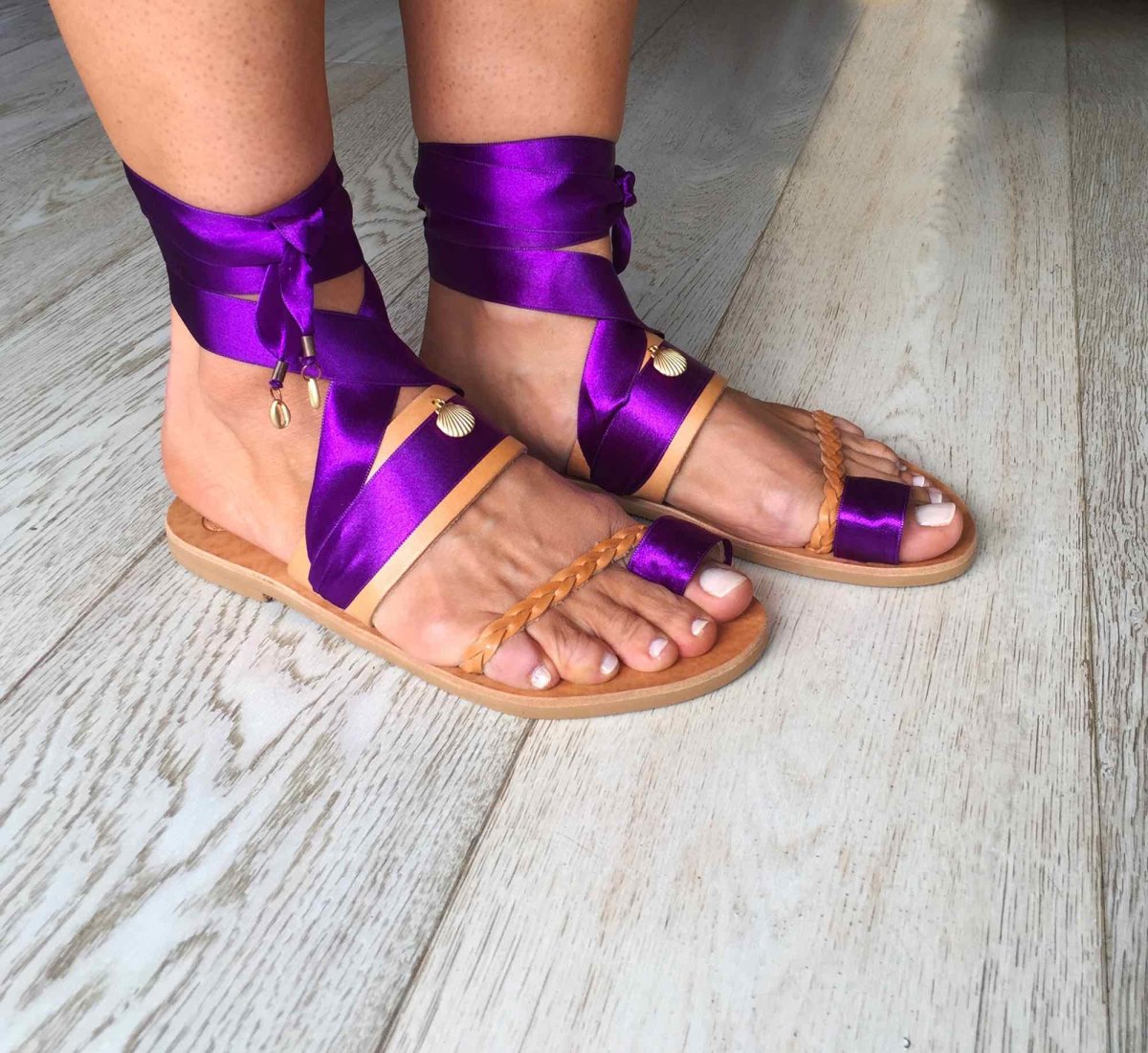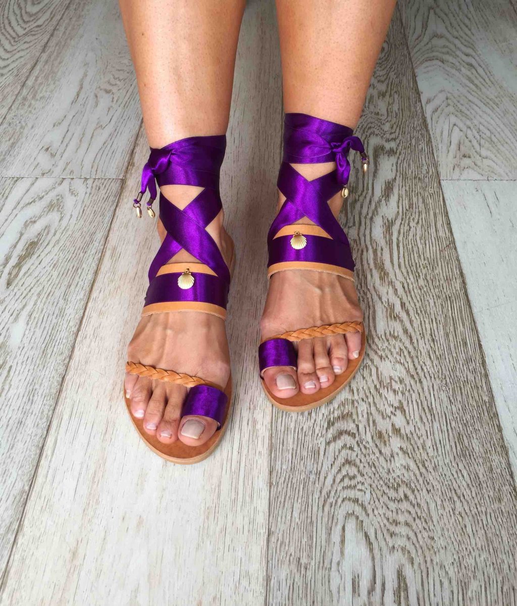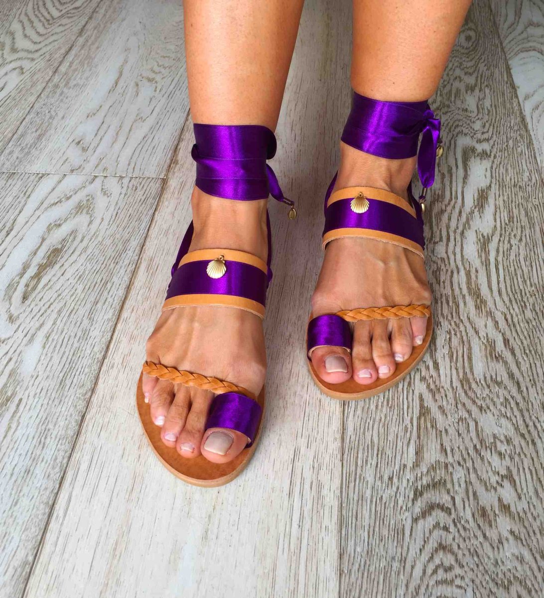 I sandali alla schiava bassi Andros sono semplici ma eleganti e si ispirano alla bellissima isola greca di Andros, nelle Cicladi, che è un importante centro della navigazione greca. L’anello sulla punta e il cinturino in pelle dei sandali sono impreziositi da bellissimi nastri di seta viola. Questi sandali greci fatti a mano sono decorati con conchiglie scintillanti, che faranno risplendere il tuo look. I sandali sono realizzati in vera pelle greca da artigiani esperti che utilizzano tecniche tradizionali. Tutti i materiali sono cuciti a mano sui sandali in pelle in modo da garantirne la stabilità e la qualità .