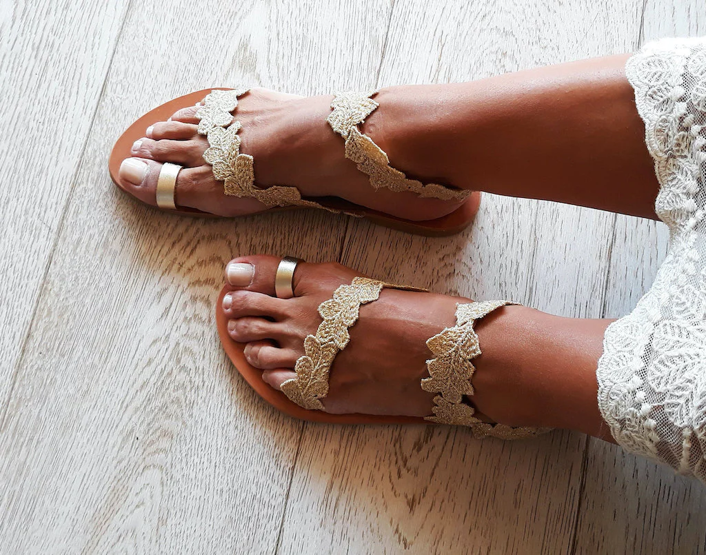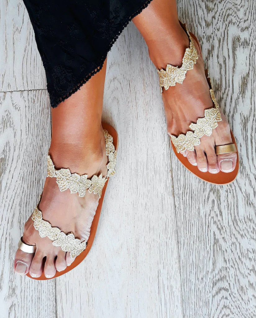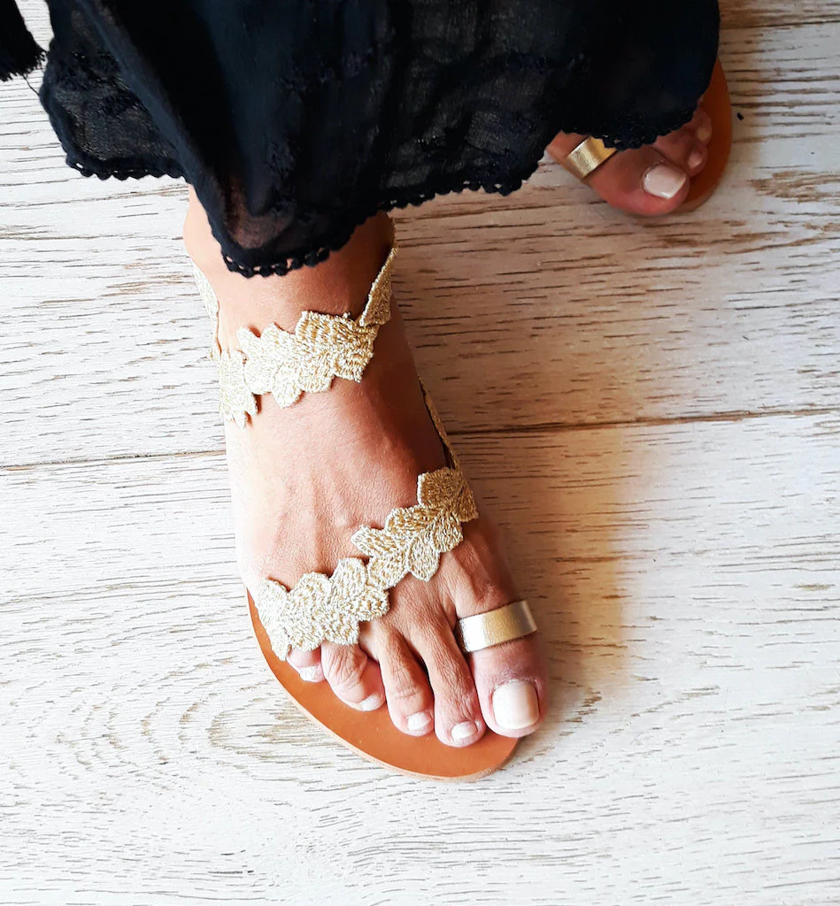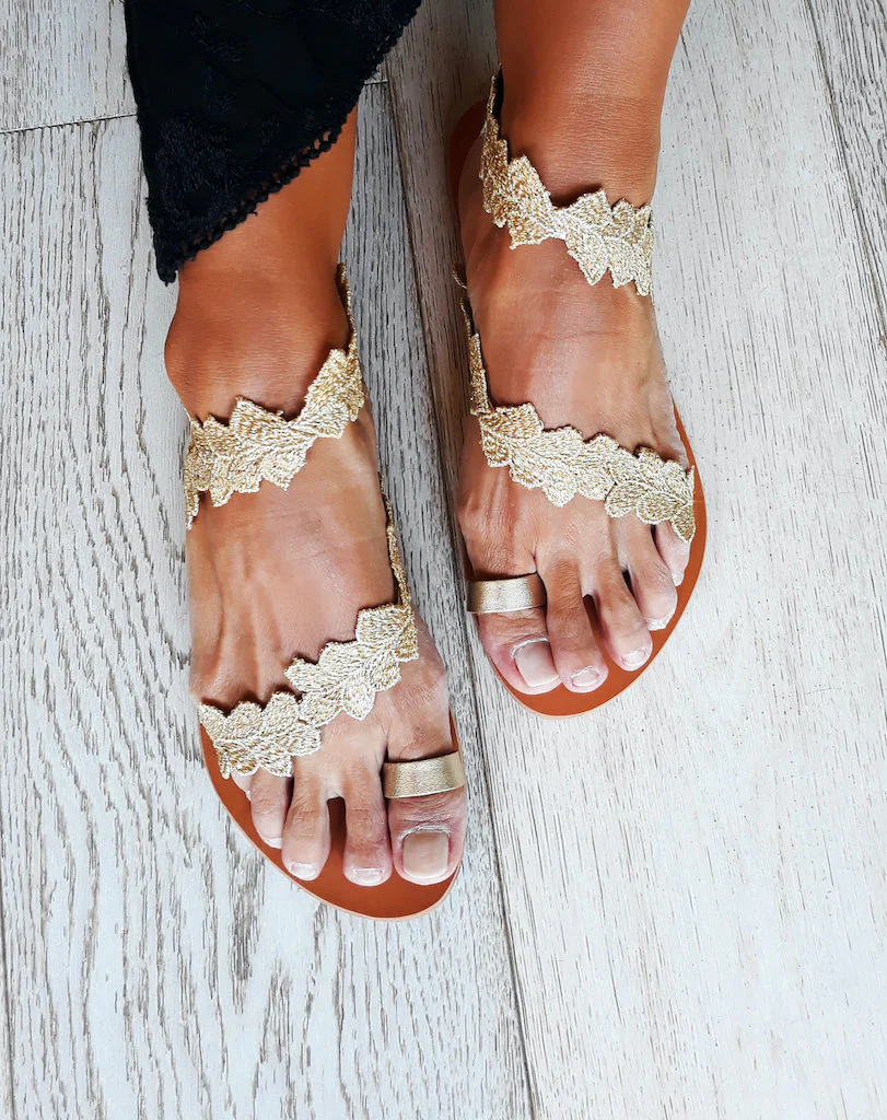 I sandali bassi color oro Daphne sono ispirati ad una delle ninfe più belle dell’antica mitologia greca, nemmeno il dio Apollo le ha saputo resistere. Questi sandali piatti da sposa sono decorati da finiture floreali ricamate dorate. È la scelta perfetta per un romantico matrimonio sulla spiaggia, ma puoi anche indossarle per una serata fuori con un semplice abito maxi boho o i tuoi jeans. Tutti gli abbellimenti sono cuciti a mano su pelle. I sandali sono realizzati in vera pelle greca da artigiani esperti che utilizzano tecniche tradizionali. Tutti i materiali sono cuciti a mano sui sandali in pelle in modo da garantirne la stabilità e la qualità .