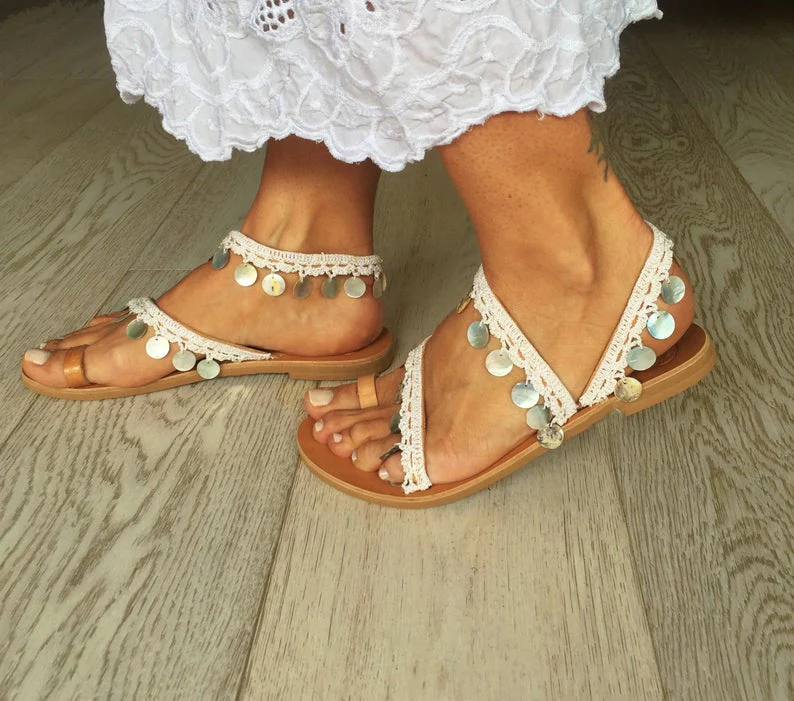 I sandali bassi da sposa Katerina sono ispirati alla bellissima ragazza greca che ha suggerito questo disegno. Questi sandali greci fatti a mano su ordinazione sono adornati da pizzo bianco e piccoli ciondoli in madreperla. È la scelta perfetta per un matrimonio etnico ma puoi indossarlo anche in qualsiasi altra occasione come una serata fuori. Tutti gli abbellimenti sono cuciti a mano su pelle. I sandali sono realizzati in vera pelle greca da artigiani esperti che utilizzano tecniche tradizionali. Tutti i materiali sono cuciti a mano sui sandali in pelle in modo da garantirne la stabilità e la qualità .