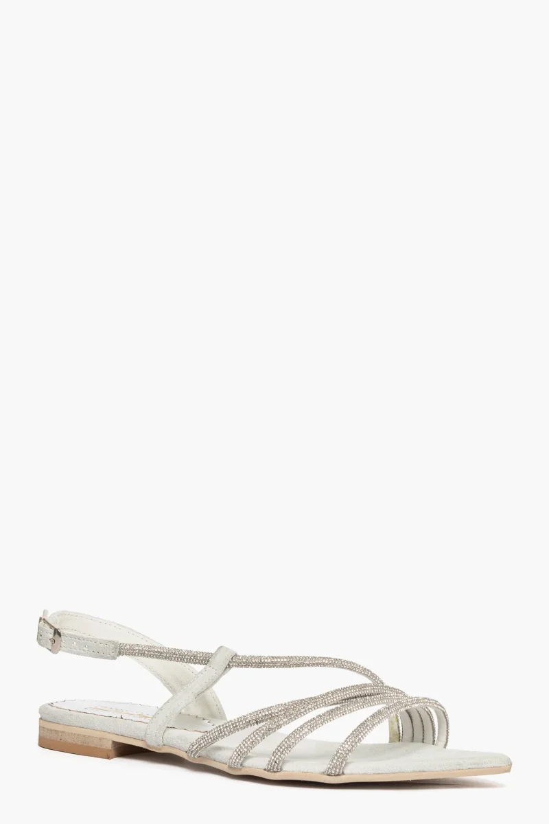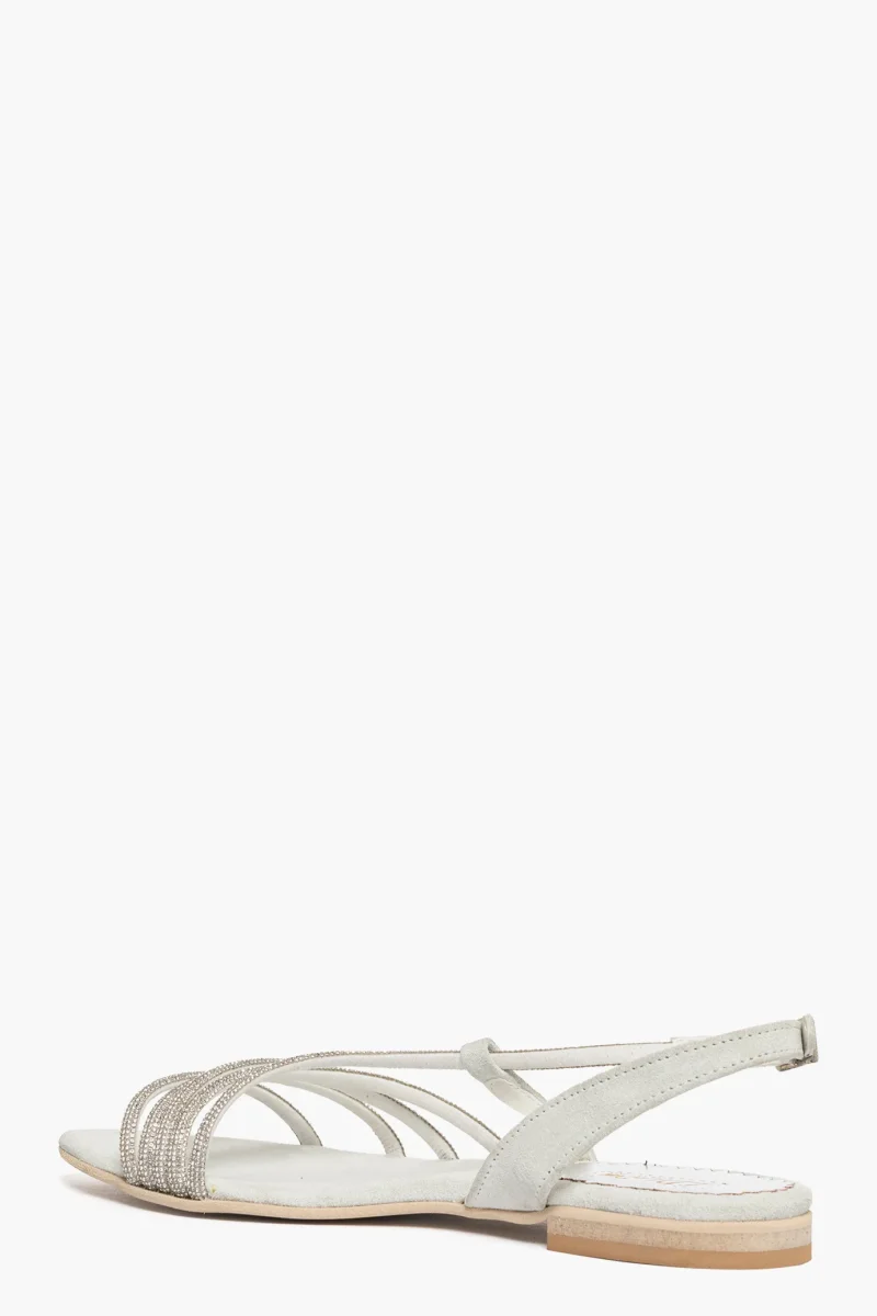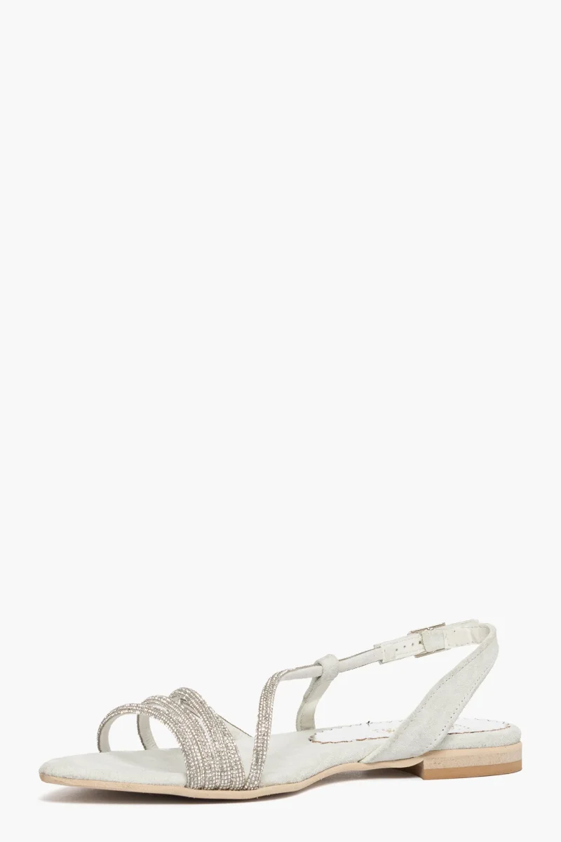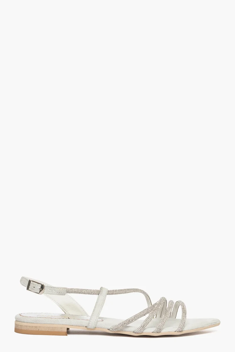 Sandali in camoscio ghiaccio con strass nel colore argento, cinturino con fibbietta nel colore argento. Calzano regolari, con punta, calzature artigianali, made in Italy.