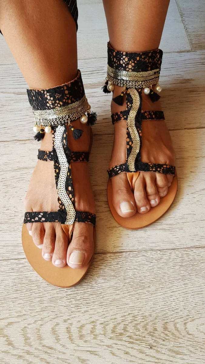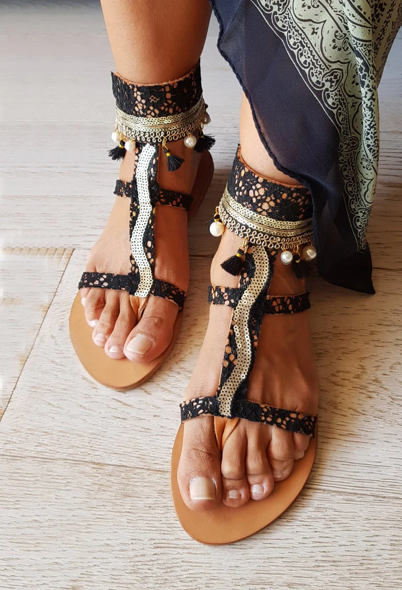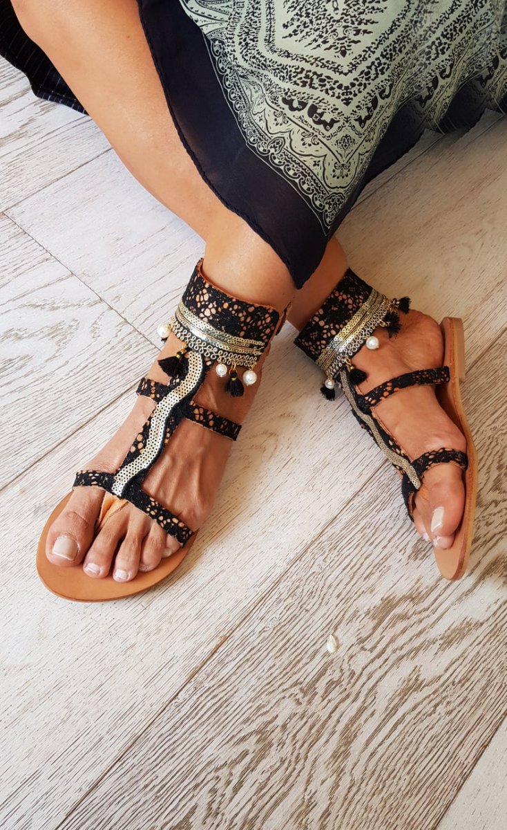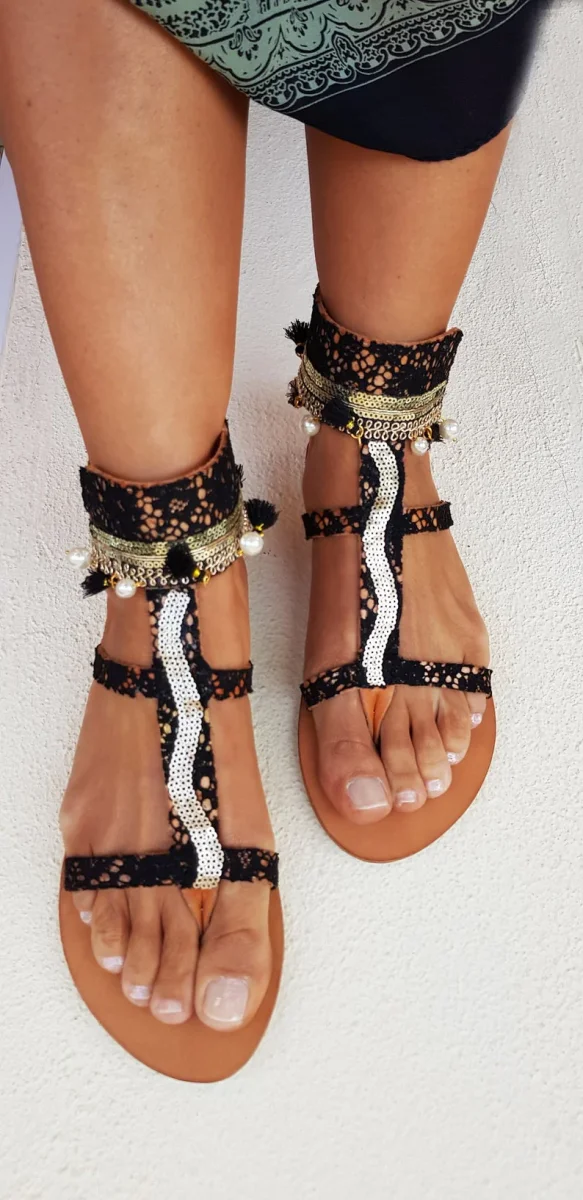 Sandali greci in pelle realizzati a mano su ordinazione. I sandali gladiatore bassi Mythos sono uno dei nostri preferiti, con il loro stile sbarazzino, il loro lusso e i dettagli in stile boho chic. Impreziosito da decorazioni color oro e nero, il sandalo Mythos ha anche un bracciale alla caviglia, decorato con finiture dorate scintillanti. A causa del processo di produzione, l’abbellimento dei sandali richiede una certa quantità di tempo. Possono essere indossati con un semplice maxi abito o con un abito da sera. La varietà degli elementi decorativi inoltre riflette la luce del sole garantendo un effetto scintillante che non potrà passare inosservato. I sandali sono realizzati in vera pelle greca da artigiani esperti che utilizzano tecniche tradizionali. Tutti i materiali sono cuciti a mano sui sandali in pelle in modo da garantirne la stabilità e la qualità .