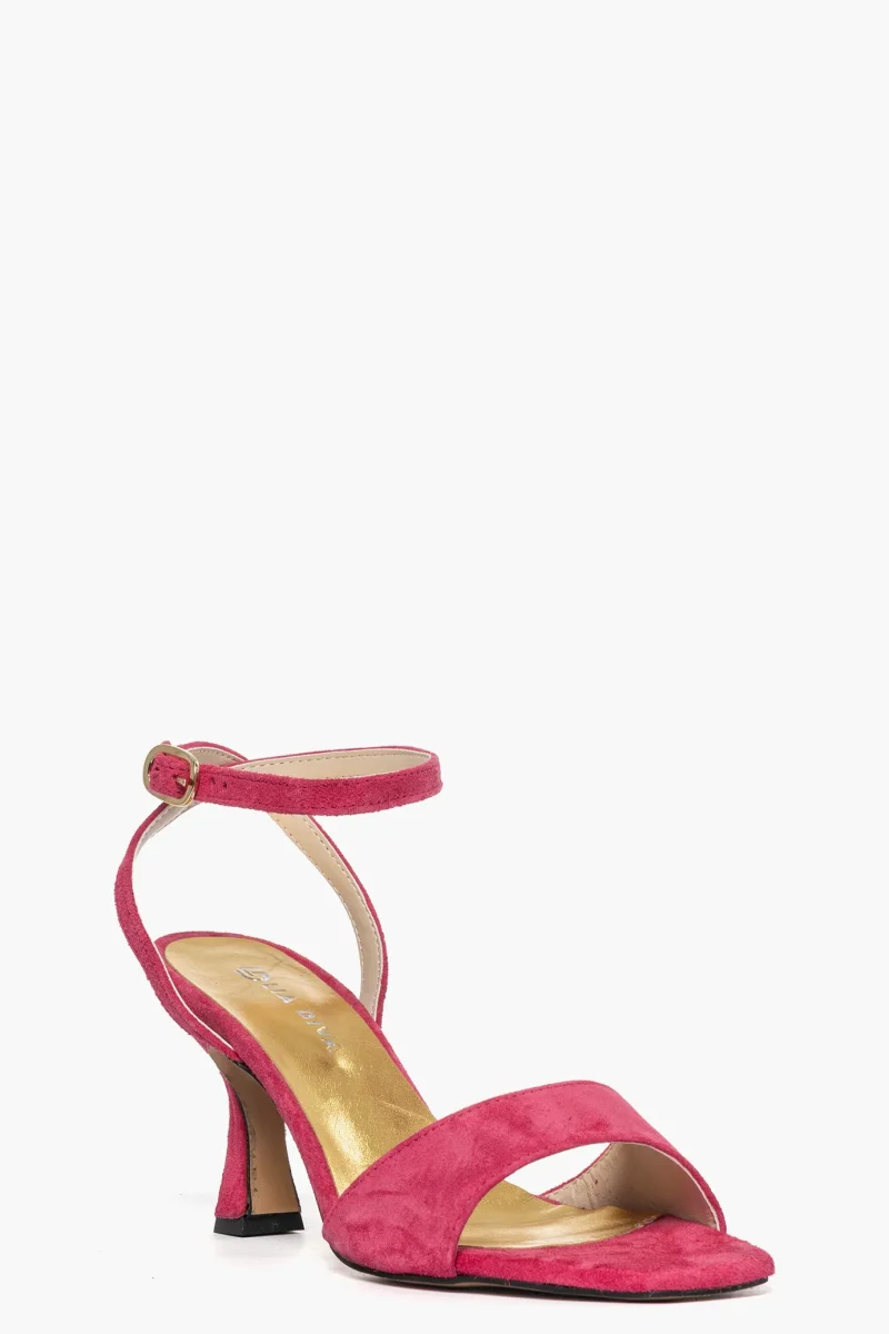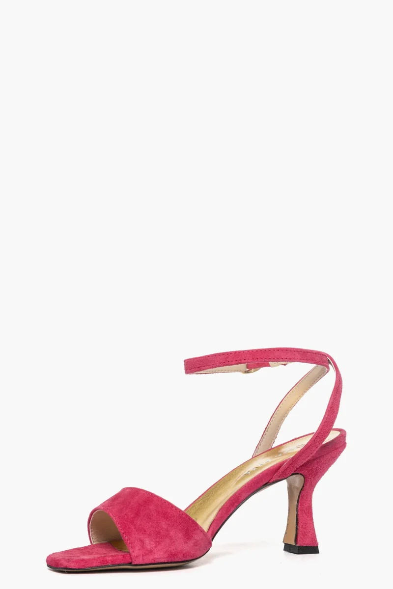Sandalo in camoscio fucsia con cinturino alla caviglia e fibbietta nel colore oro, interni in similpelle, tacco rivestito 8.5. Calzano regolari, calzature artigianali, made in Italy.