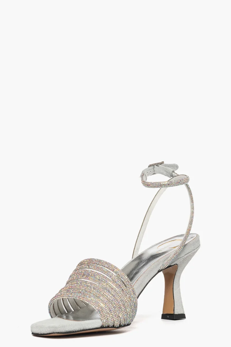 Sandali in camoscio ghiaccio e strass argento boreale, con cinturino alla caviglia regolabile con fibbietta in color argento. Sottopiede in similpelle e camoscio ghiaccio. Tacco rivestito, 8,5 cm. Punta quadrata, calzata regolare. Calzature realizzate artigianalmente, rigorosamente made in Italy.