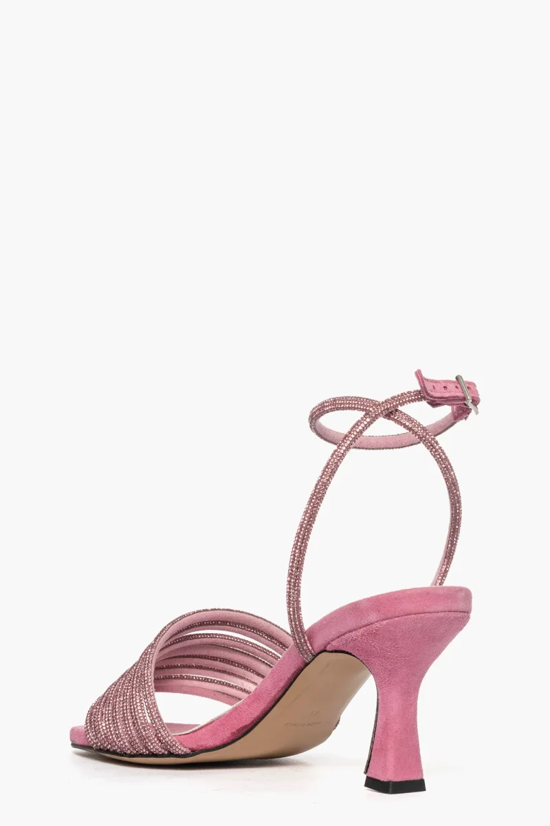 Sandali in camoscio rosa e strass rosa, con cinturino alla caviglia con strass rosa e regolabile con fibbietta in color argento. Sottopiede in similpelle e camoscio rosa. Tacco alto 8,5 cm e rivestito in camoscio rosa. Punta quadrata, calzata regolare. Calzature realizzate artigianalmente, rigorosamente made in Italy.
