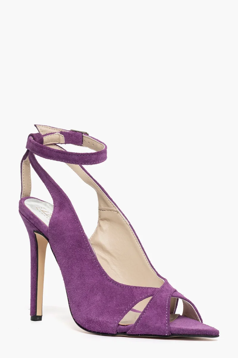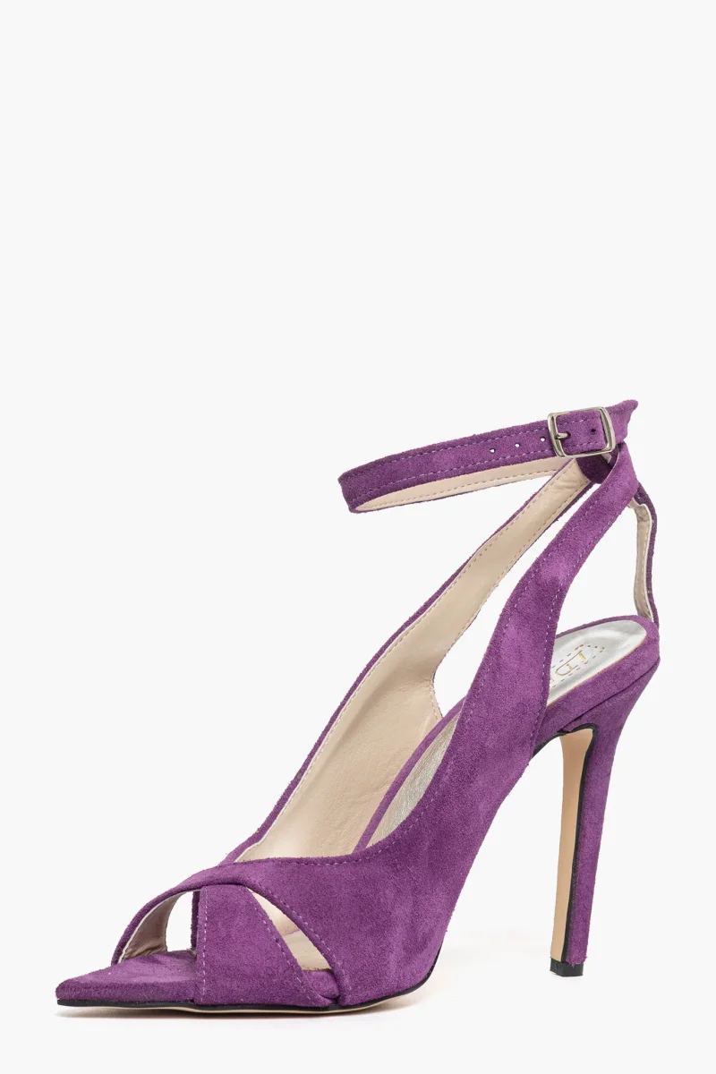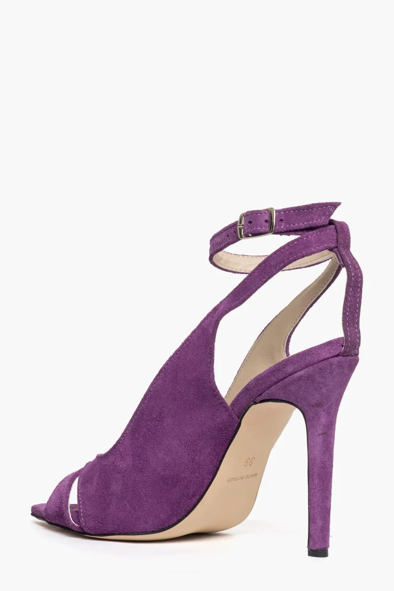 Sandalo in camoscio viola con cinturino alla caviglia regolabile con fibbietta nel colore argento, tacco rivestito, altezza 11, interni in similpelle. Calzano regolari, punta in avanti. Calzature artigianali, made in Italy.