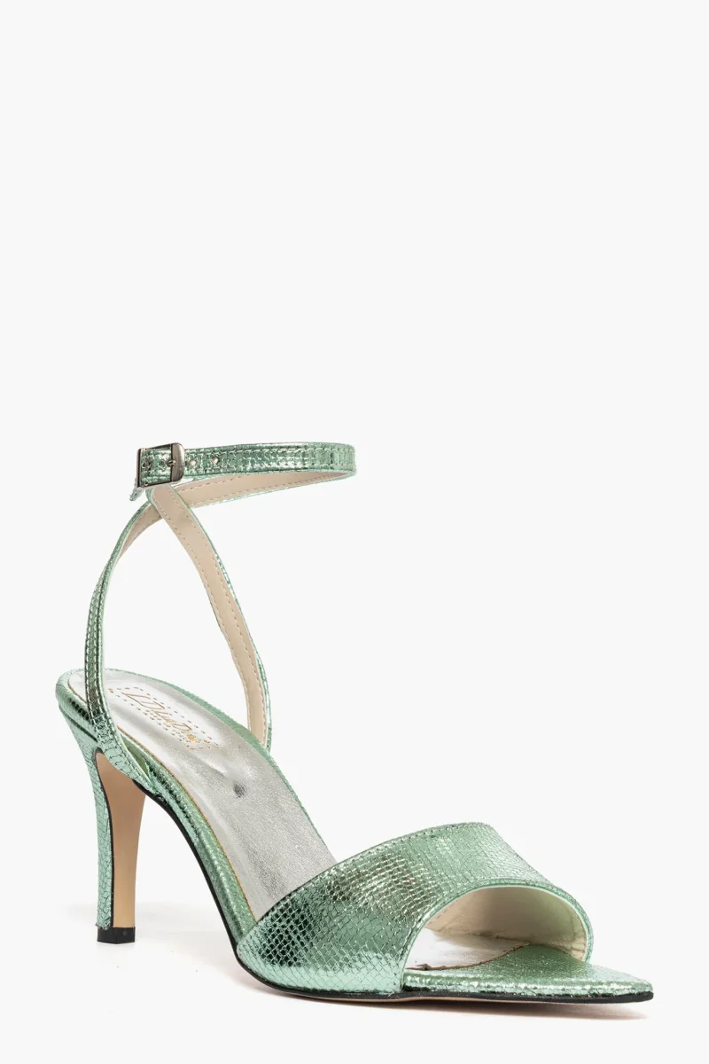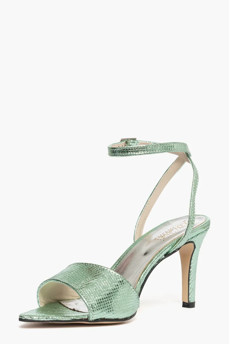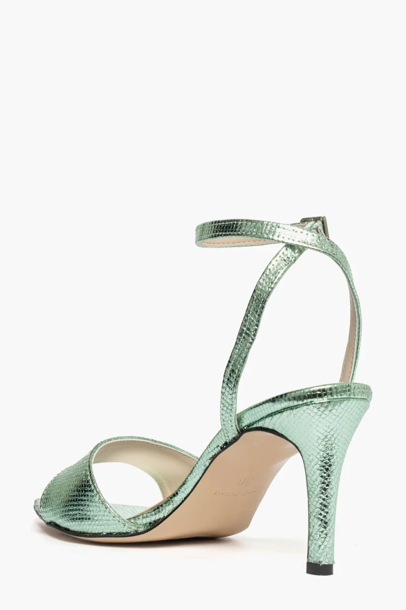 Sandalo in sintetico vipera semilucido nel colore verde, cinturino ad incrocio con fibbia nel colore oro regolabile alla caviglia, interni in similpelle, tacco rivestito, 8.5. Calzano regolari, punta in avanti. Calzature artigianali, made in Italy.
