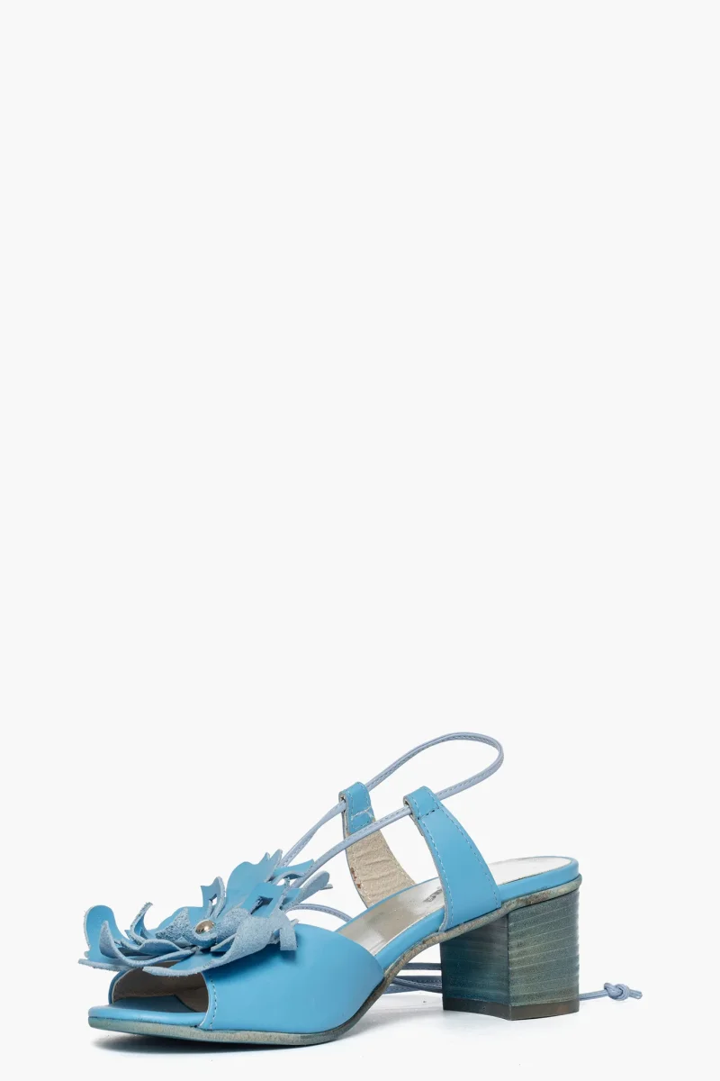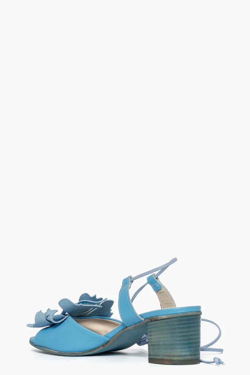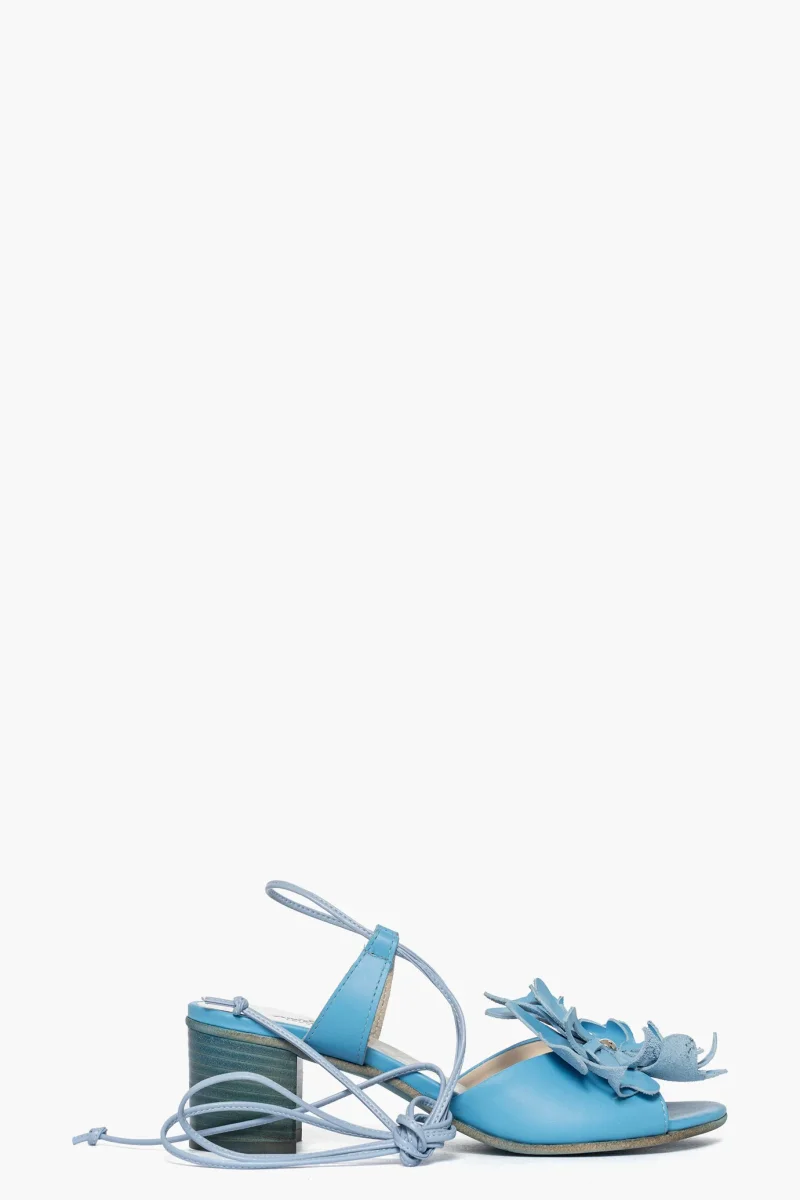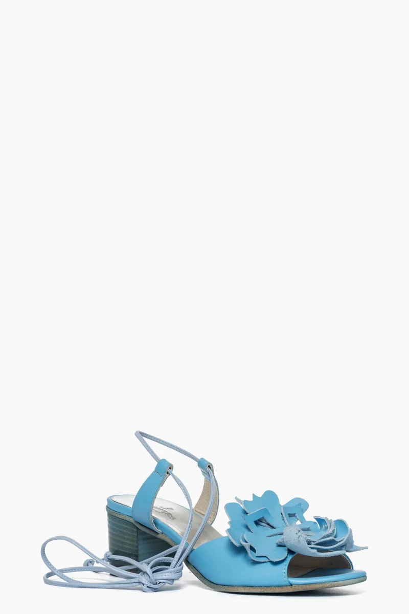 Sandalo pelle azzurro con applicato un fiore, laccio alla caviglia tacco 5 spazzolato in tinta, interno in similpelle, soletta in pelle, calzano regolari, punta tonda. Calzature artigianali, made in Italy.