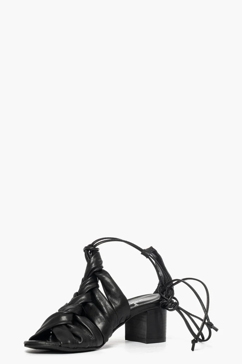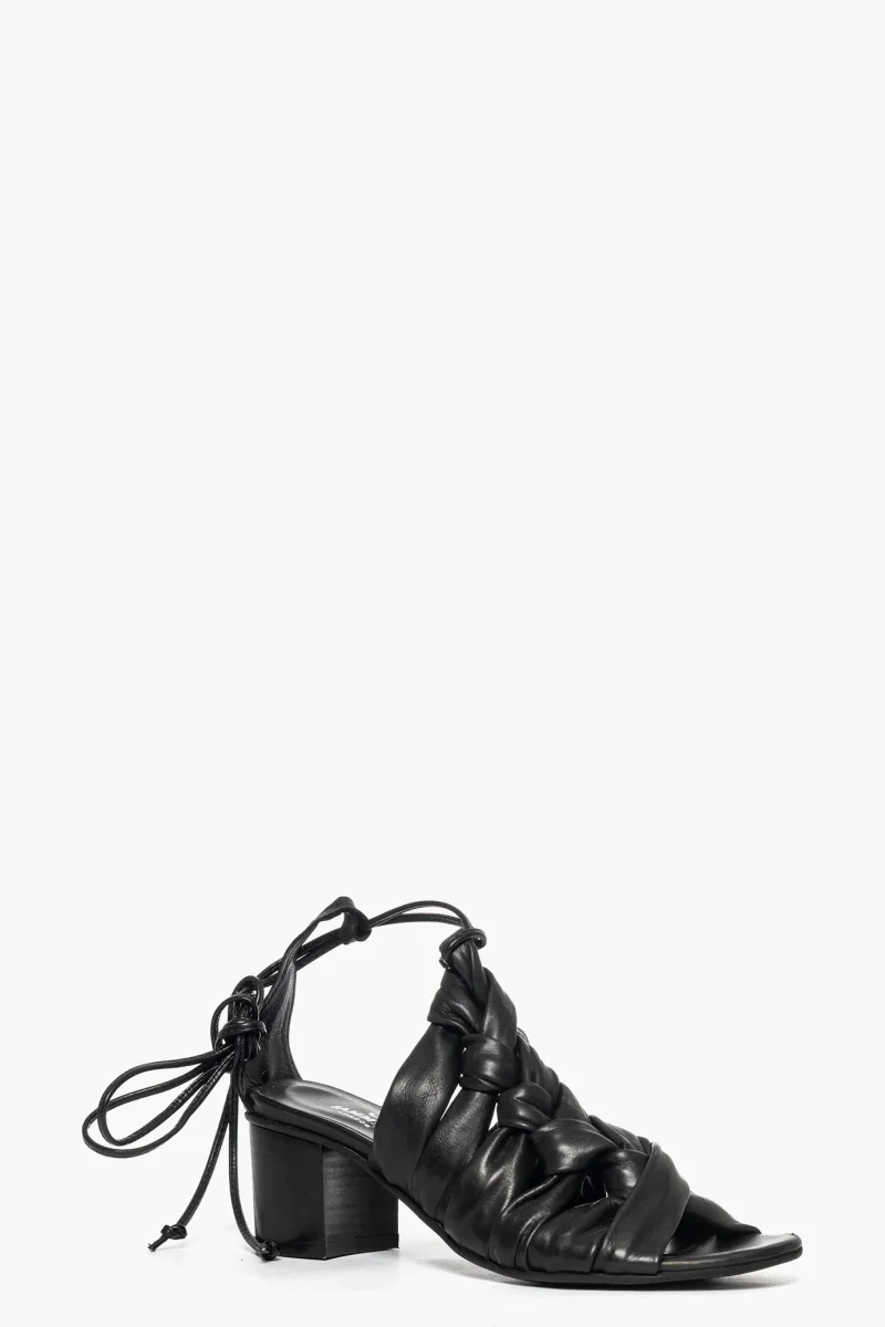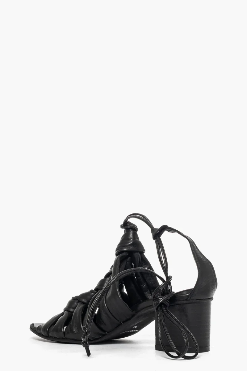 Sandalo pelle nero a intreccio, laccio alla caviglia, interni in pelle, tacco 5 nel colore nero, calzano regolari, punta tonda. Calzature artigianali, made in Italy.