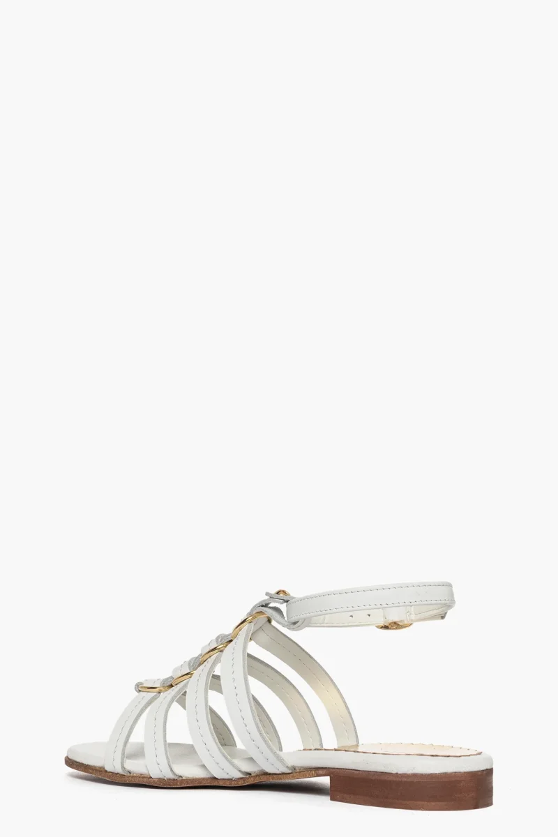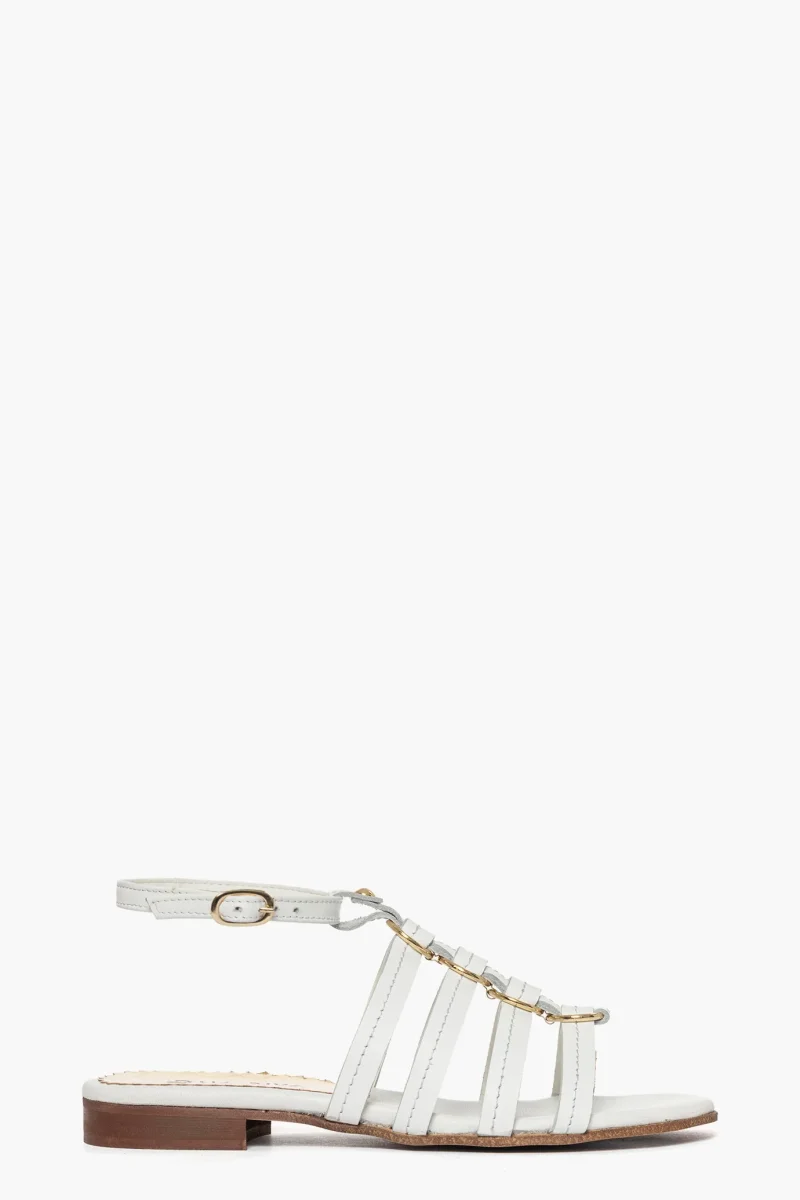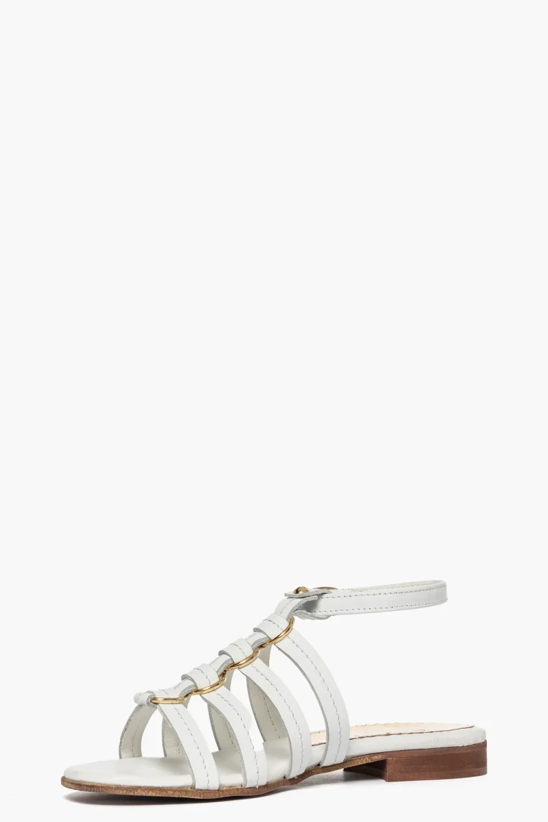 Sandalo in pelle bianco con anelli in avanti nel colore oro, cinturino alla caviglia con fibbietta nel colore oro, interni in similpelle, soletta interna in pelle bianco. Calzano regolari, punta tonda, suola neutra spazzolata, altezza 2. Calzature artigianali, made in Italy.
