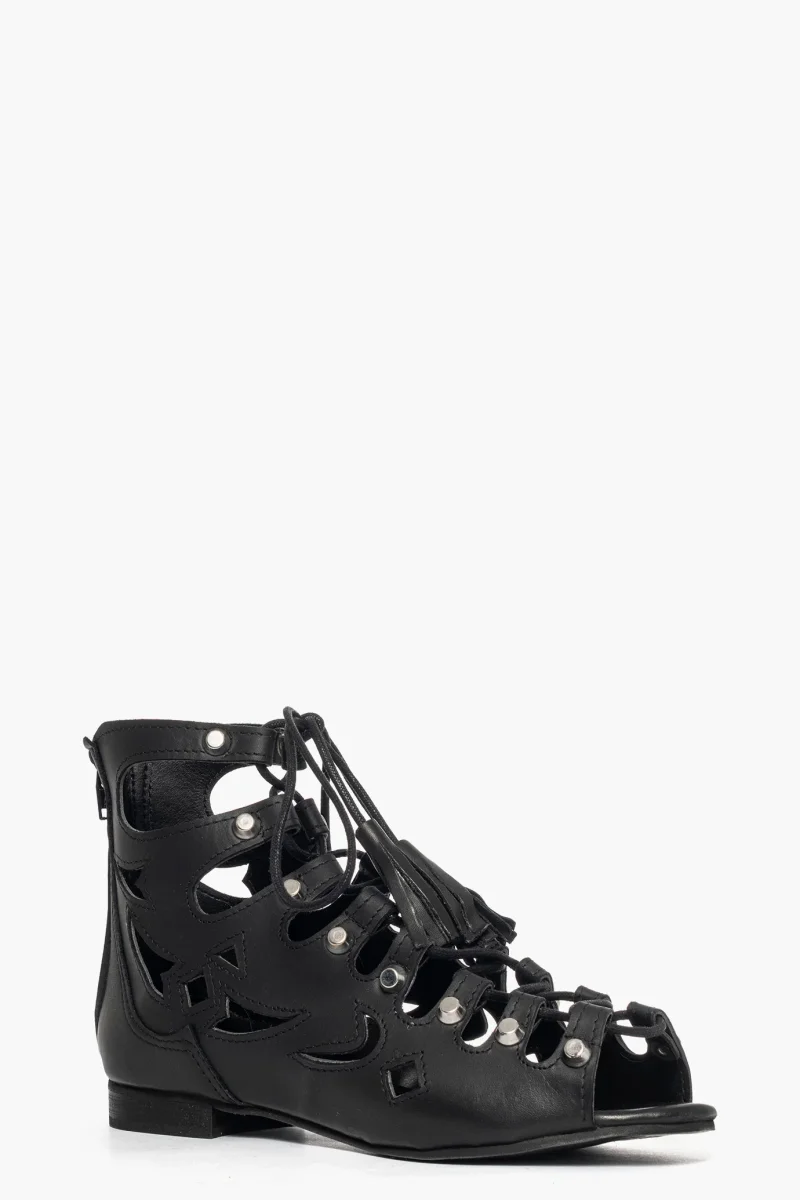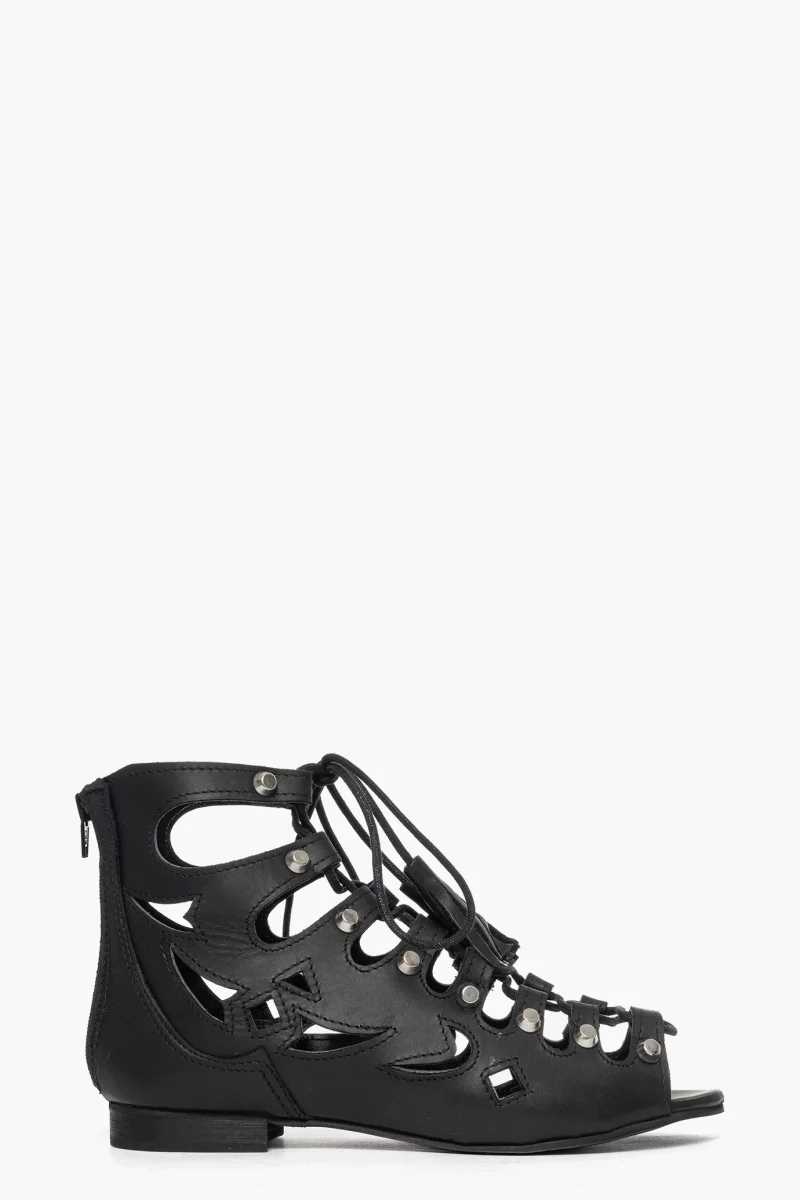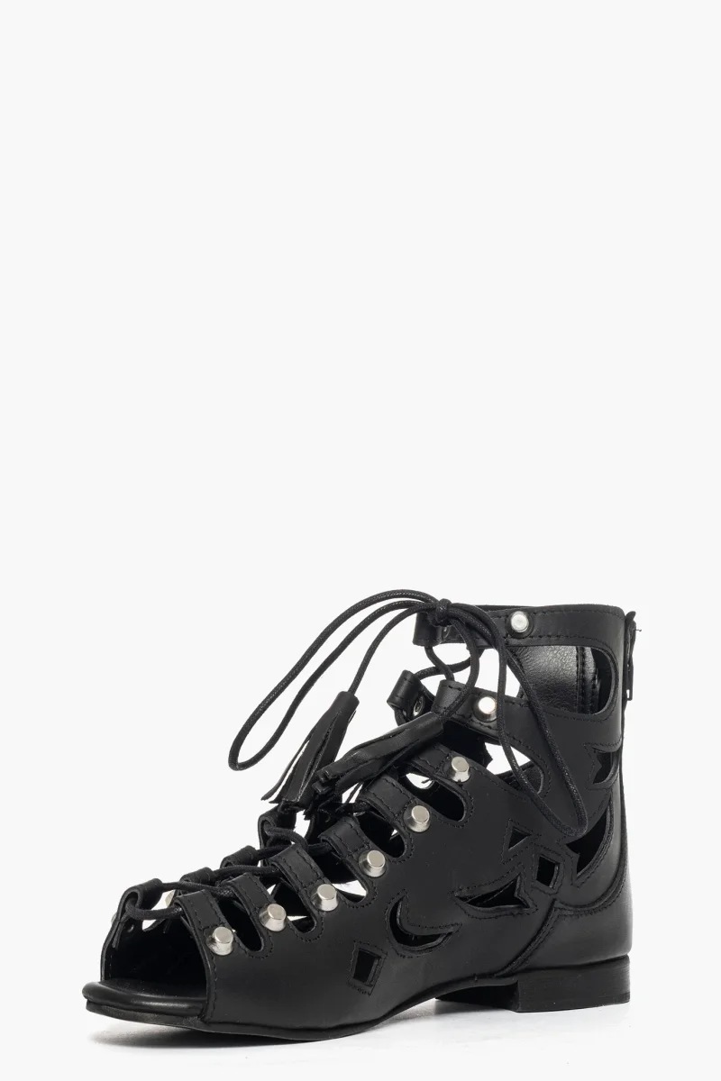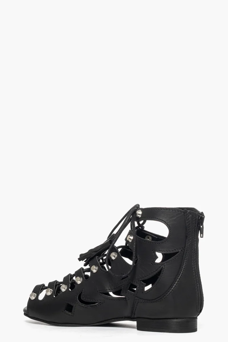Sandalo in pelle nero con lacci neri e borchie nel colore argento, zip nella parte posteriore, il laccio permette di regolare, interni in similpelle, suola nera, 1/2. Calzano comodi, calzature artigianali, made in Italy.