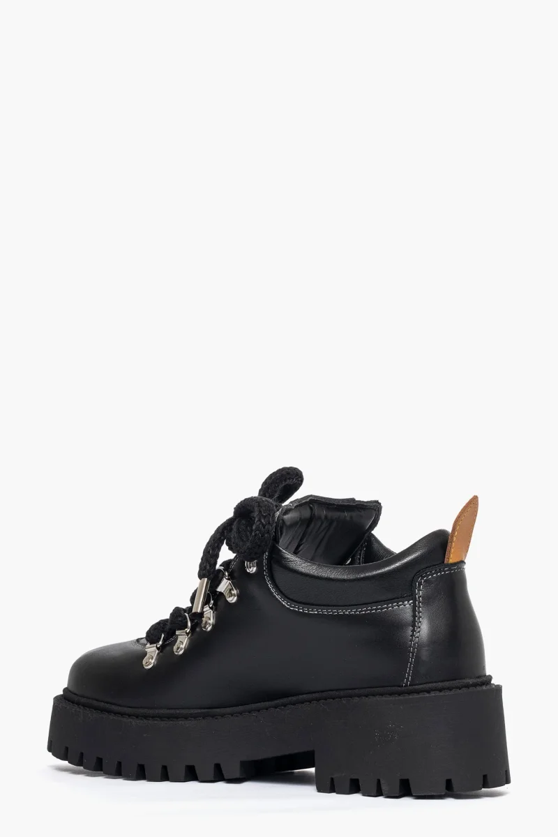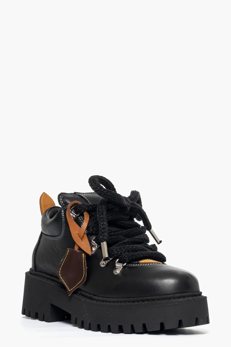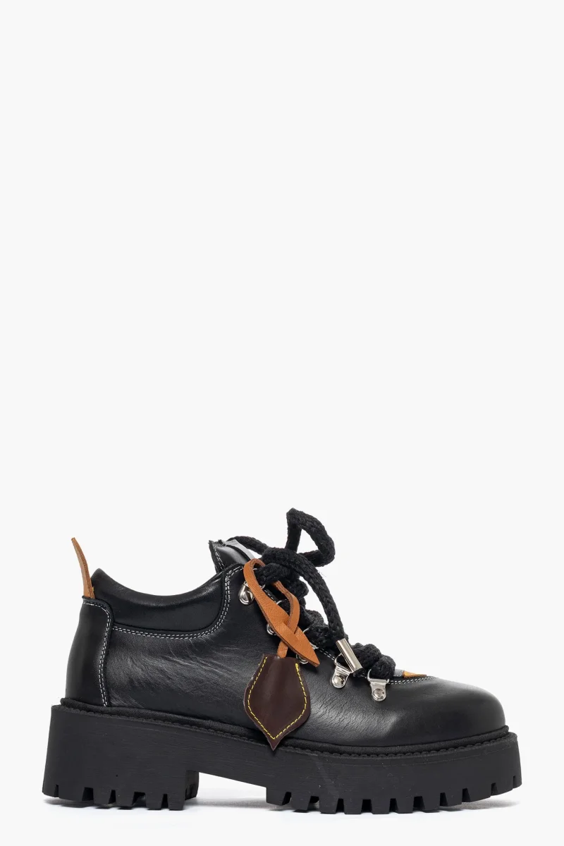 Scarpa in pelle nero e riporto pelle cuoio, interni in similpelle, lacci tondi neri, accessori nel colore argento e di lato un targa in pelle testa di moro, removibile, suola in nero altezza 5. Calzano regolari, calzature artigianali, made in Italy.