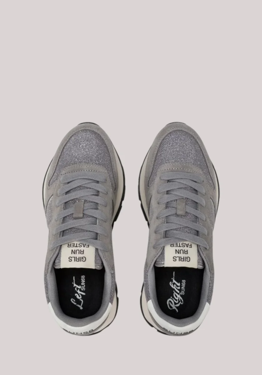 Design casual dall’estetica glamour. La sneaker Ally Glitter è l’icona SUN68 reinterpretata con una speciale tomaia in materiale glitterato, dettagli laminati e il logo ricamato in filo lurex.