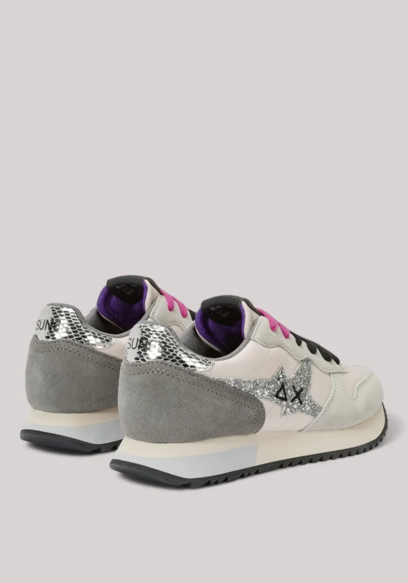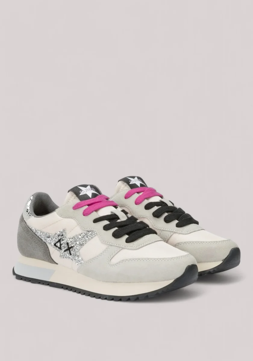 Innovativa, leggera ed estremamente femminile, Stargirl Glitter è la sneaker SUN68 che illumina i look quotidiani. La patch con glitter sul lato reinterpreta il logo in chiave moderna, mentre lo spoiler sul retro è rifinito con materale effetto snake.
