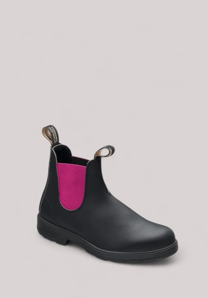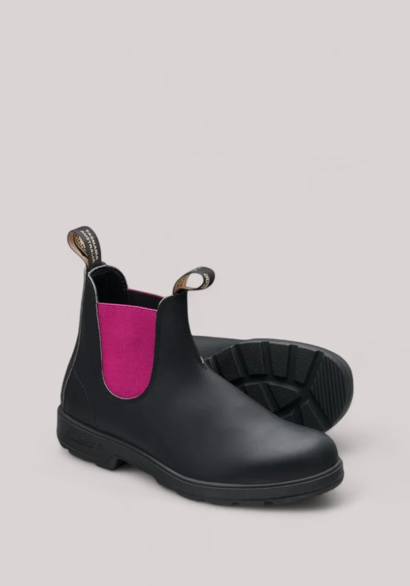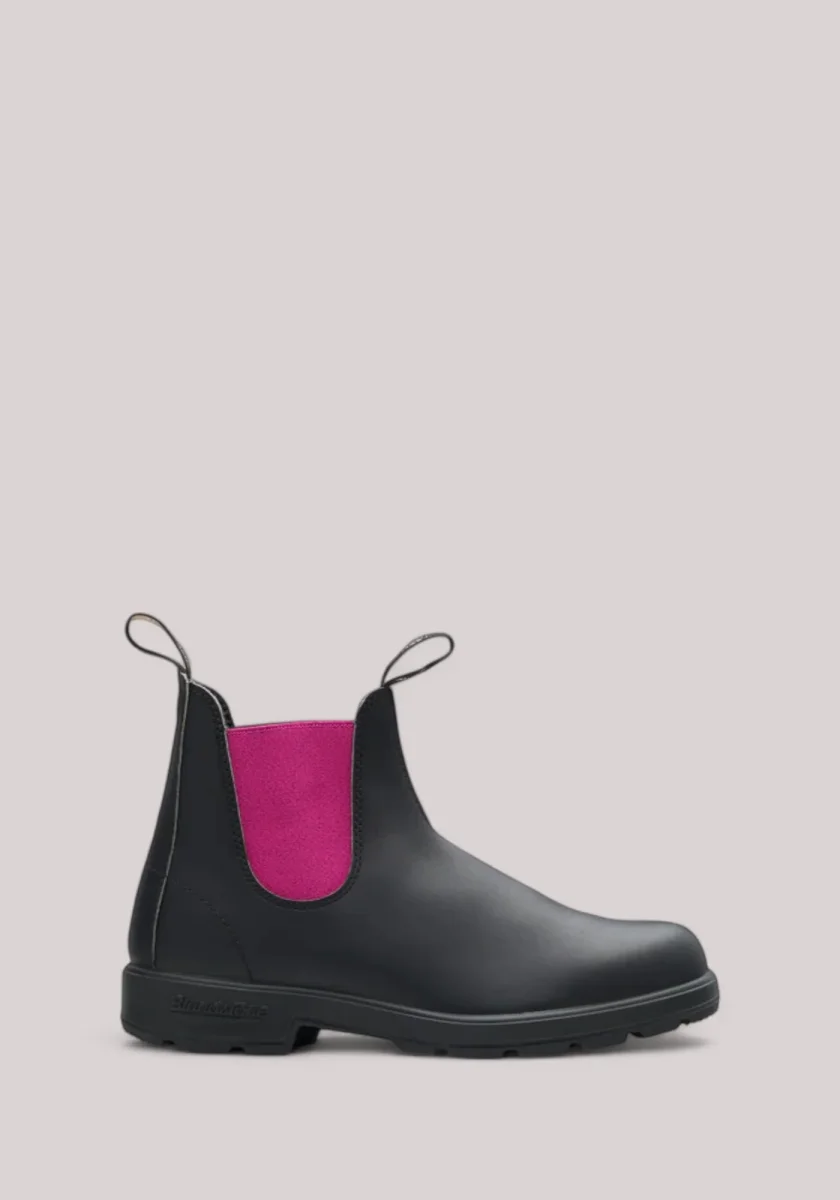 Una tomaia in pelle nera premium resistente all’acqua e un elastico color fucsia sono gli elementi chiave delle iconiche Blundstone #2208.