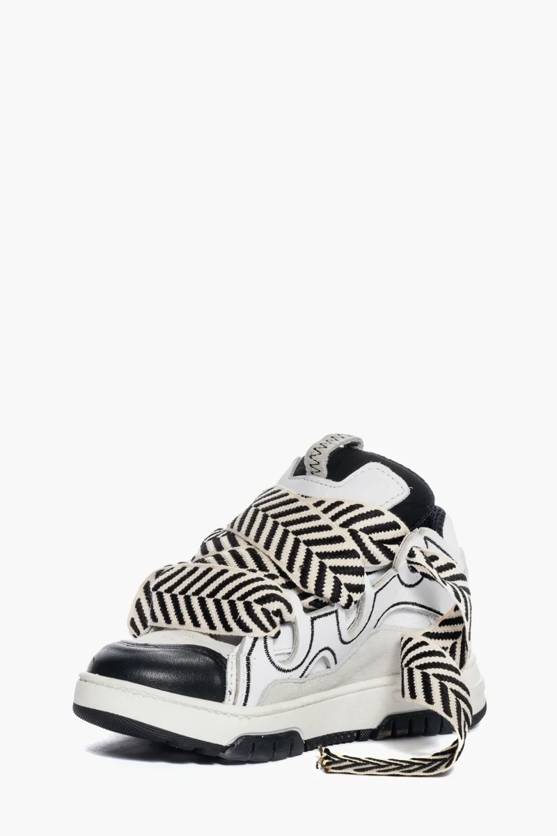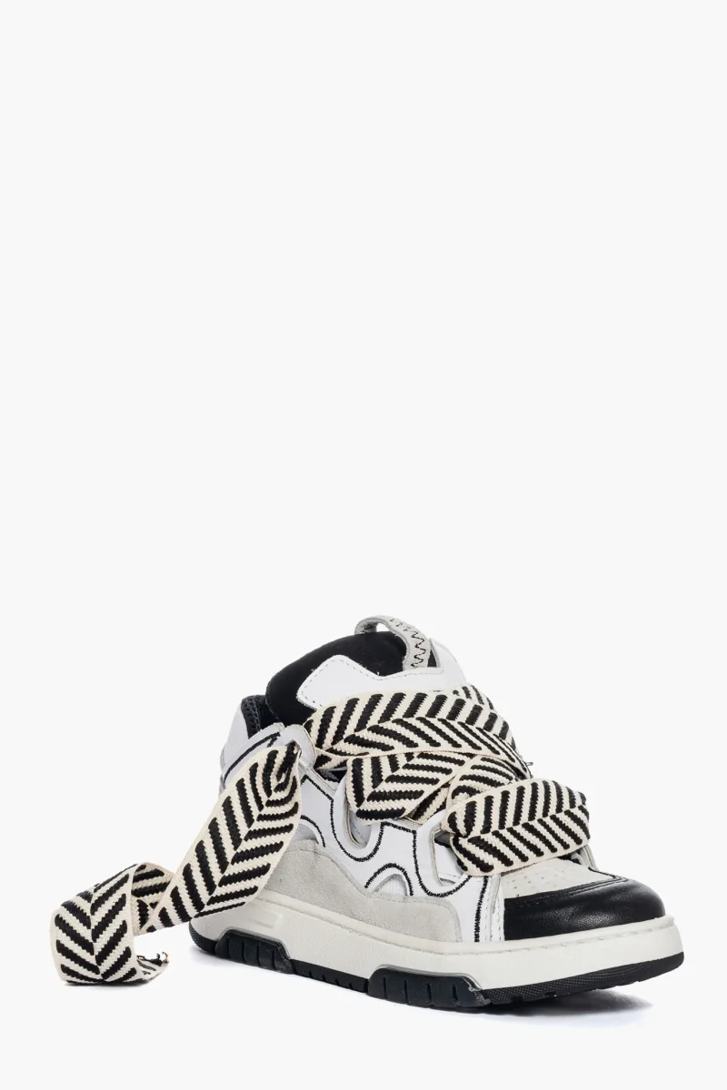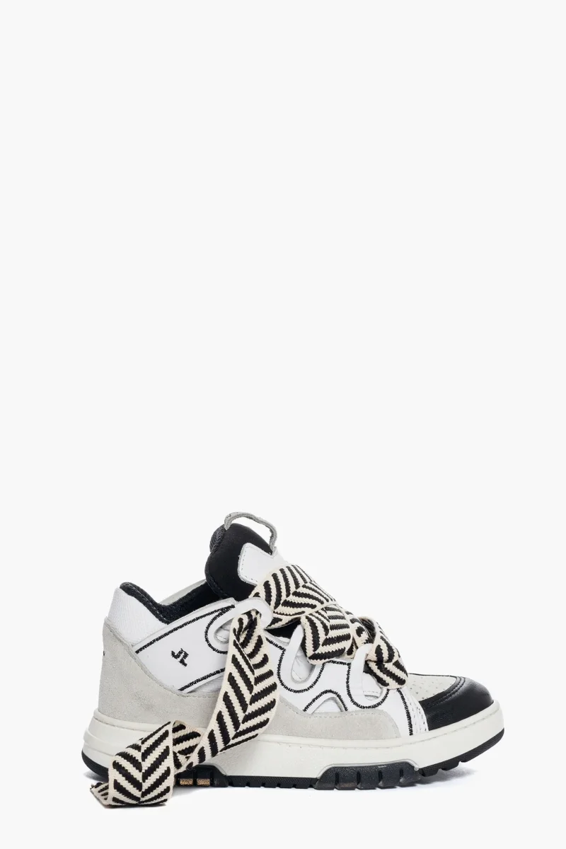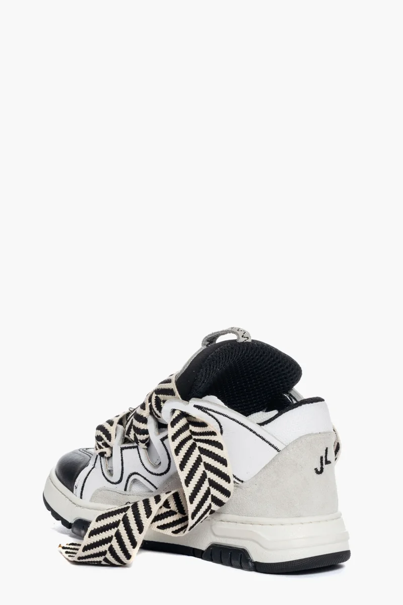 Sneakers Cambridge by Jammers London nella versione Black and White. Realizzate in pelle bianca e nera, camoscio ghiaccio e tessuto ape bianco. Suola in gomma bianca e battistrada nel colore nero. Dotate di lacci bianchi e doppio laccio largo in bianco e nero, particolare caratteristica di questo modello. Ricami che sottolineano il marchio Jammers London sia sulla linguetta e quindi sulla parte frontale, che ai lati con la sigla JL. Interno in spugna nel colore in tinta ed altezza suola 3 cm. Calzata regolare. Calzature realizzate artigianalmente, rigorosamente made in Italy.