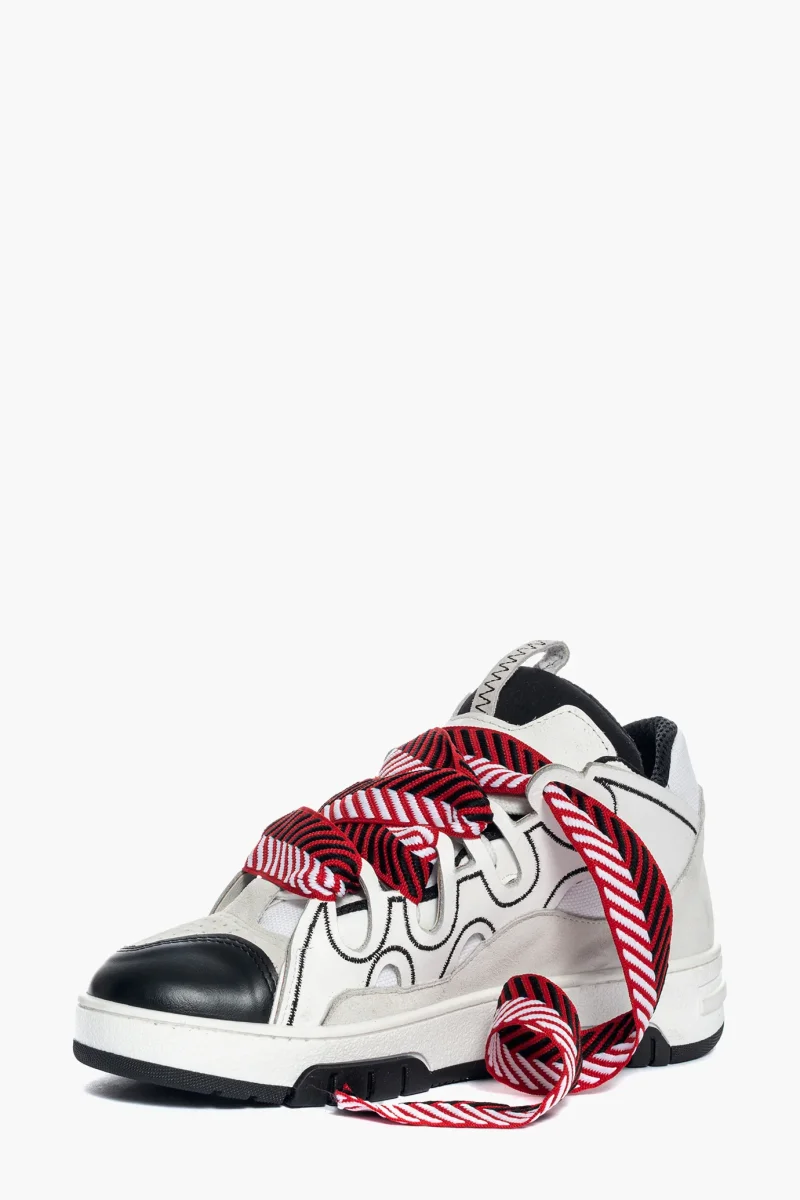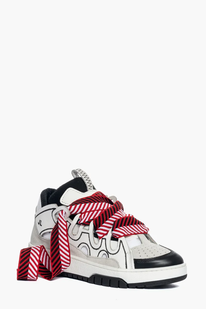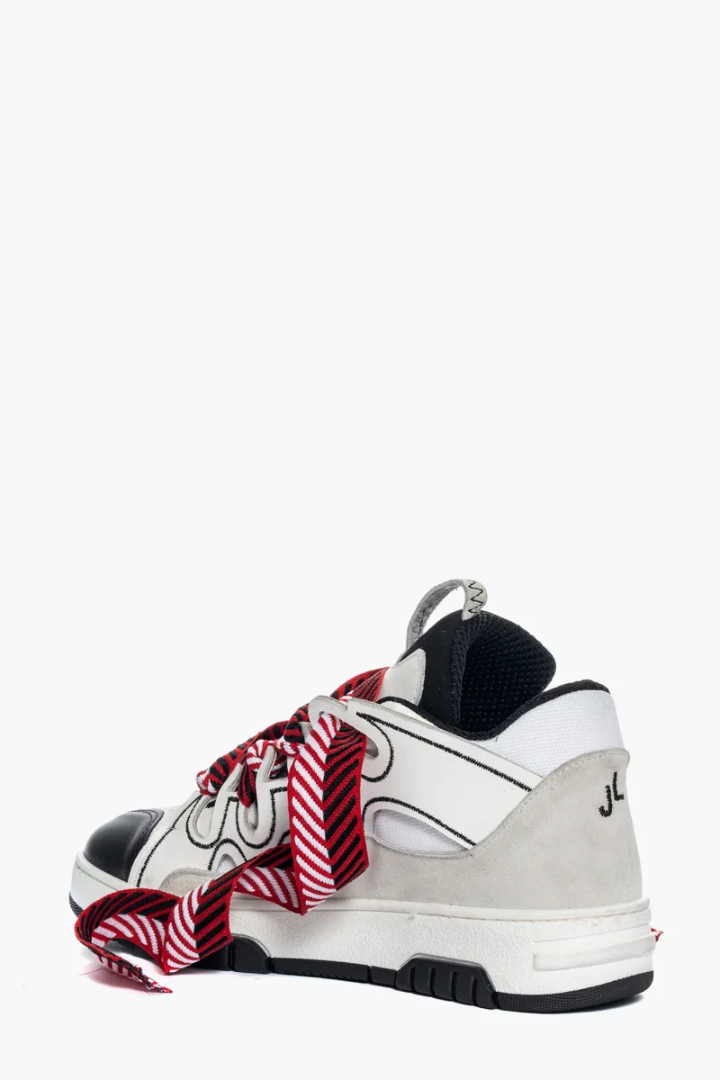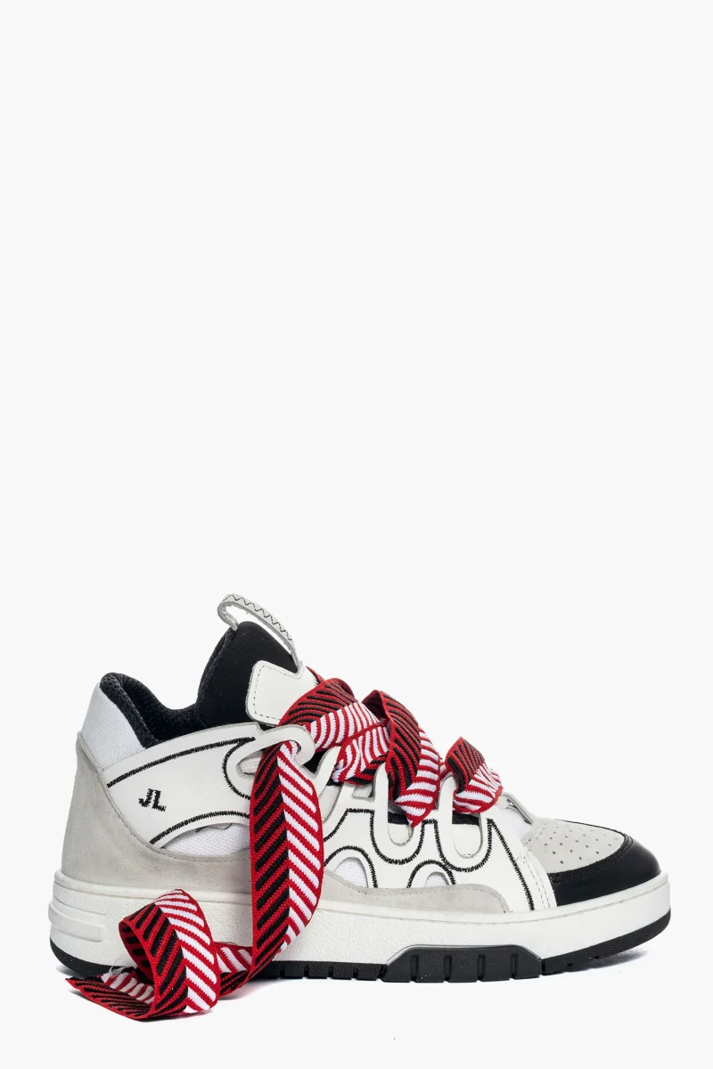 Sneakers Cambridge by Jammers London nella versione Black White and Red. Realizzate in pelle bianca e nera, camoscio ghiaccio e tessuto ape bianco. Suola in gomma bianca e battistrada nel colore nero. Dotate di lacci bianchi e doppio laccio largo in bianco, rosso e nero, particolare caratteristica di questo modello. Ricami che sottolineano il marchio Jammers London sia sulla linguetta e quindi sulla parte frontale, che ai lati con la sigla JL. Interno in spugna nel colore in tinta ed altezza suola 3 cm. Calzata regolare. Calzature realizzate artigianalmente, rigorosamente made in Italy.