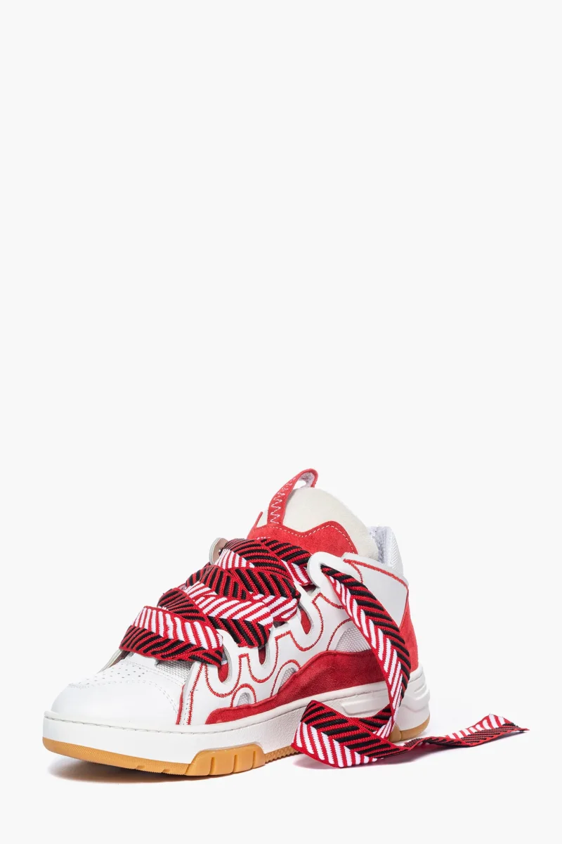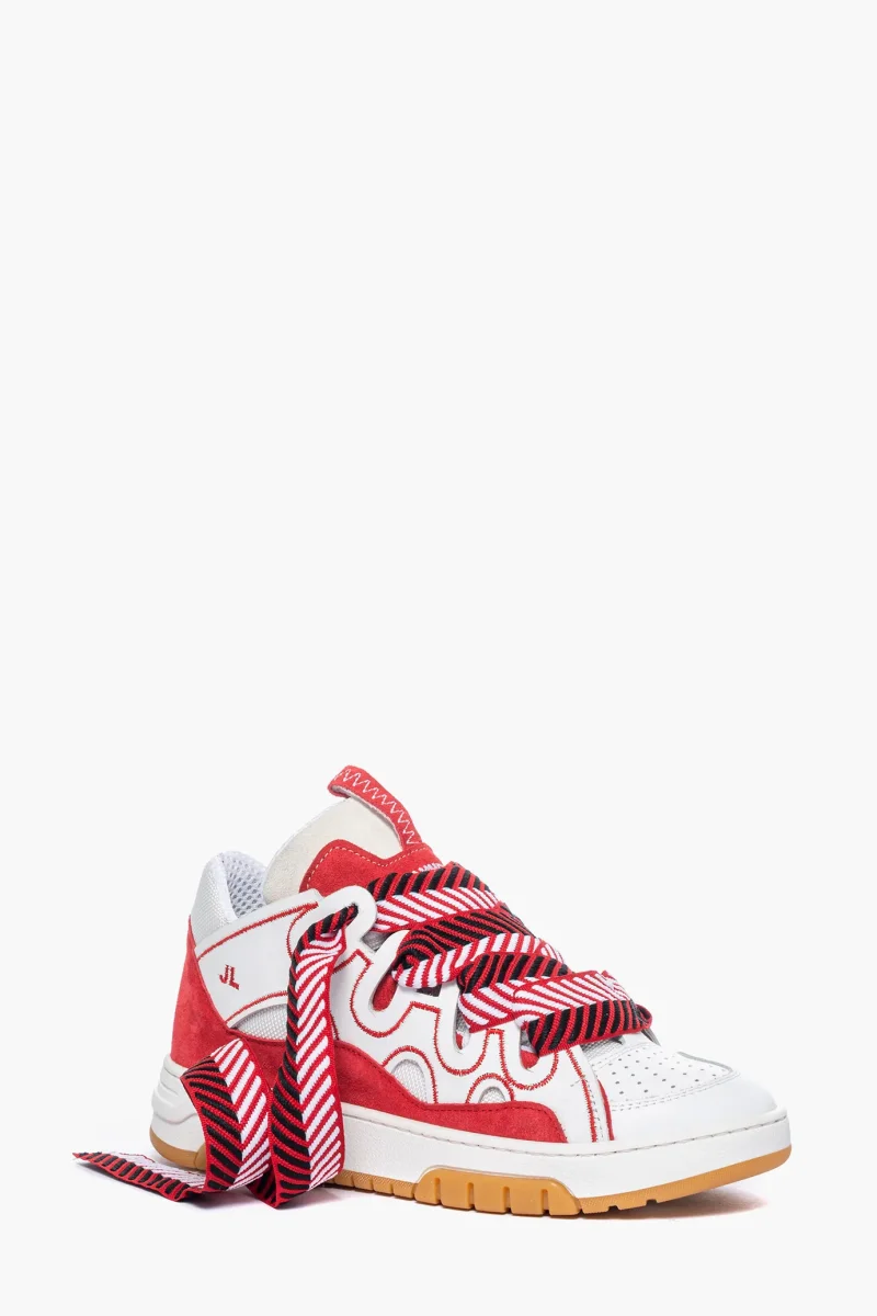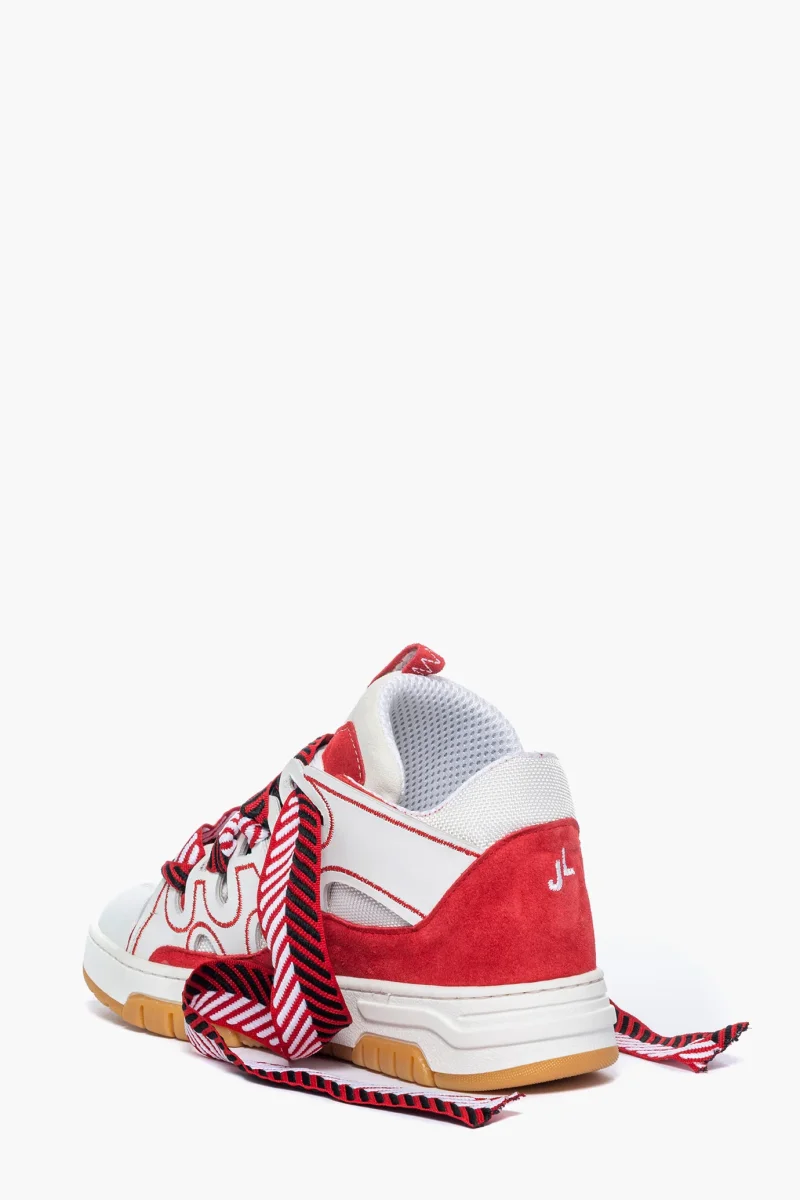 Sneakers Cambridge by Jammers London nella versione white & red. Realizzate in pelle bianca e riporto in camoscio rosso e tessuto ape bianco, riporto sulla linguetta in pelle bluette. Suola in gomma bianca e battistrada nel colore ambra. Dotate di lacci bianchi e doppio laccio largo rosso, bianco e nero, particolare caratteristica di questo modello. Ricami che sottolineano il marchio Jammers London sia sulla linguetta e quindi sulla parte frontale, che ai lati con la sigla JL. Interno in spugna nel colore in tinta ed altezza suola 3 cm. Calzata regolare. Calzature realizzate artigianalmente, rigorosamente made in Italy.