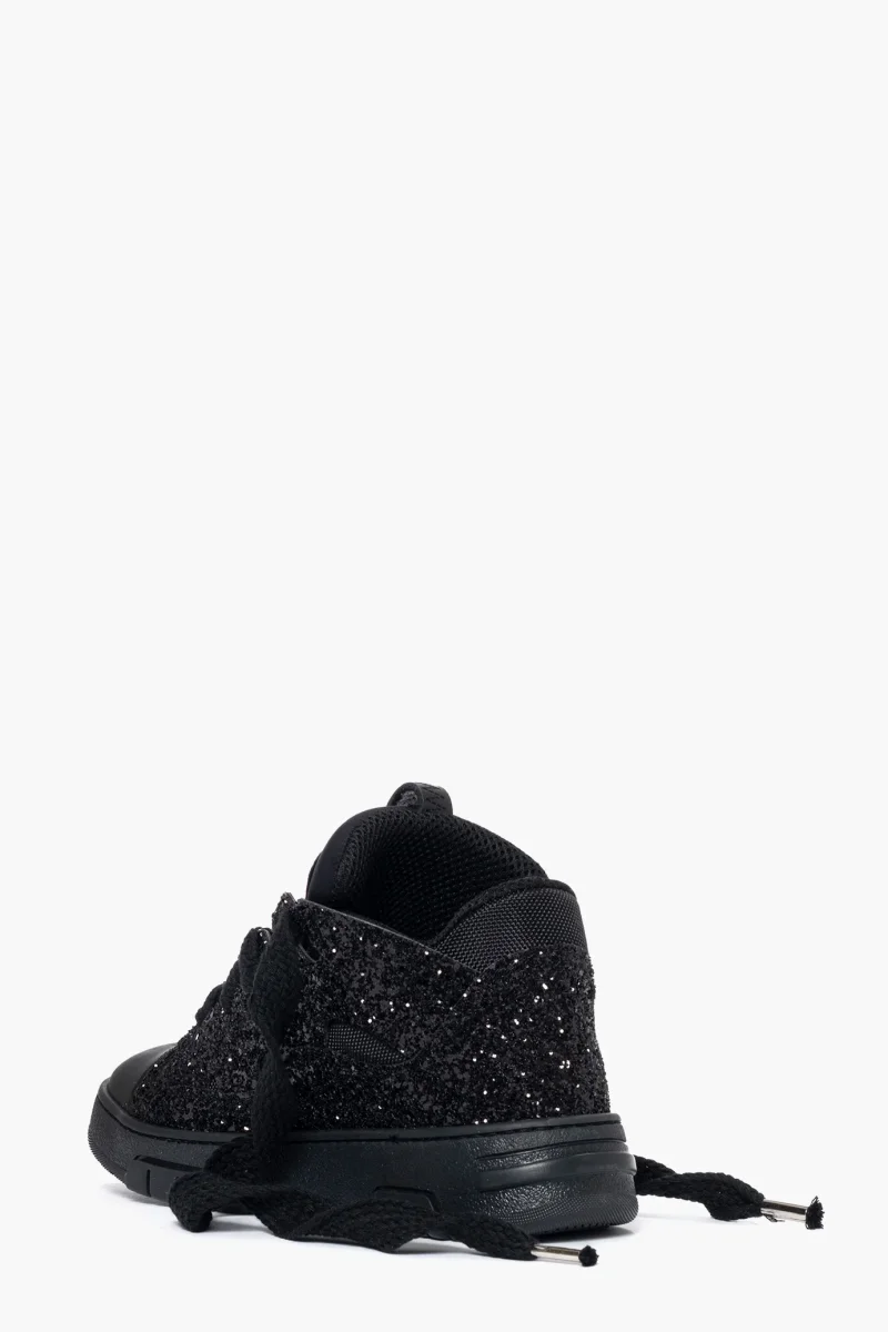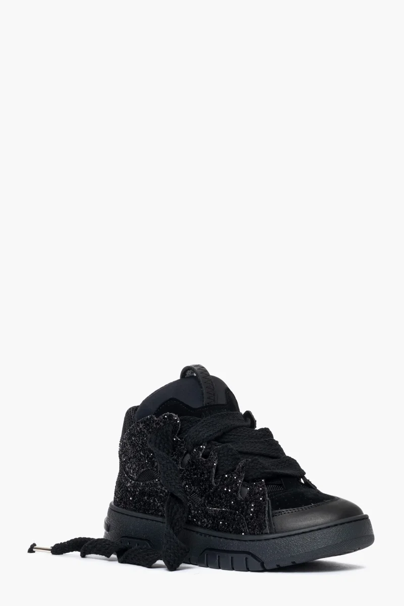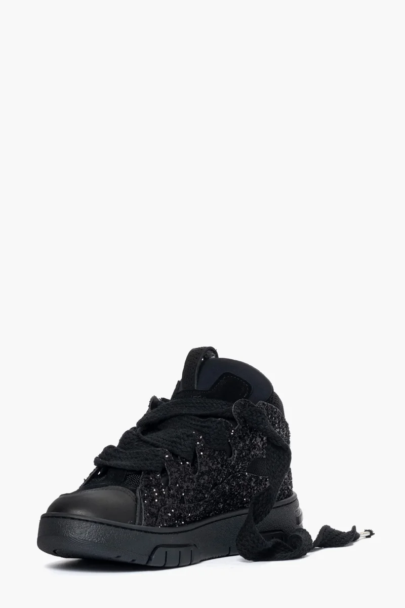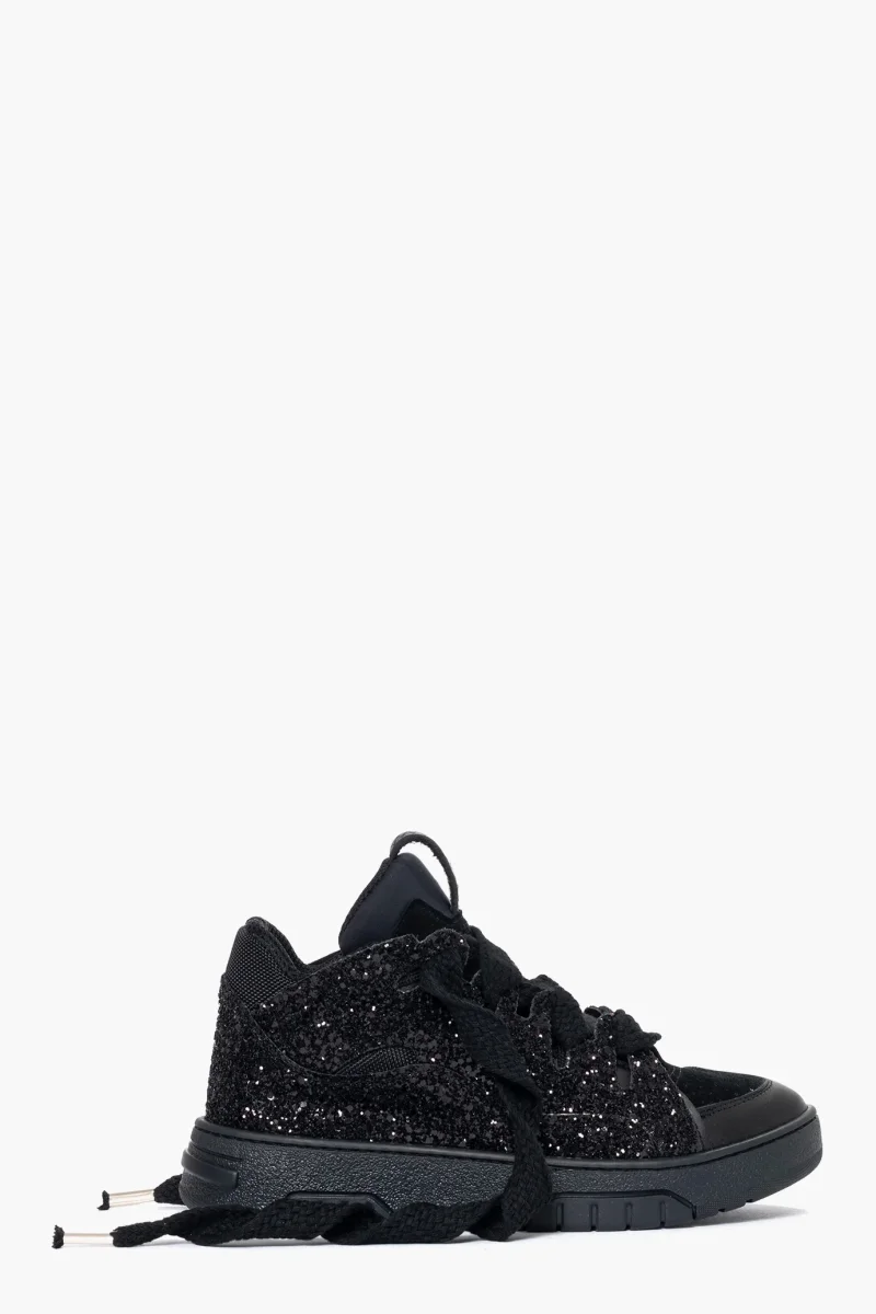 Sneakers Cambridge by Jammers London nella versione Galactic . Realizzate in pelle nera, camoscio nero e glitter nero. Suola in gomma nera. Dotate di lacci neri e doppio laccio largo nero sovrastante, particolare caratteristica di questo modello. Ricami che sottolineano il marchio Jammers London sia sulla linguetta e quindi sulla parte frontale, che ai lati con la sigla JL. Interno in spugna nel colore in tinta ed altezza suola 3 cm. Calzata regolare. Calzature realizzate artigianalmente, rigorosamente made in Italy.