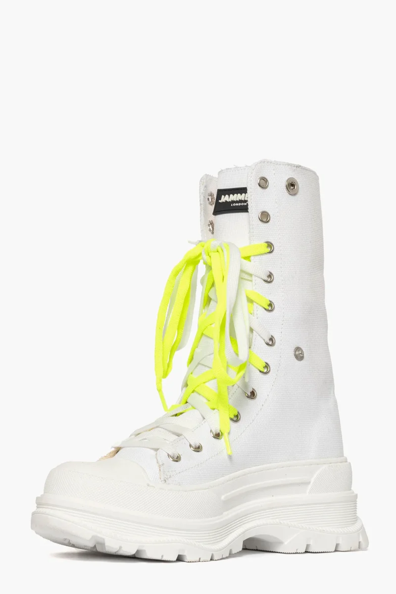 Sneakers in denim bianco alte sopra alla caviglia, ma avendo le clip ai lati e possibile il risvolto e tenerli più bassi alla caviglia, doppio laccio, bianco e giallo fluo, sulla linguetta targhetta in gommato nero con marchio JL, suola in gomma bianca, 5. Calzano comodi, calzature artigianali, made in Italy.