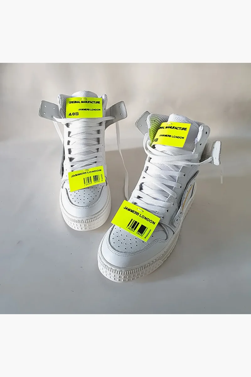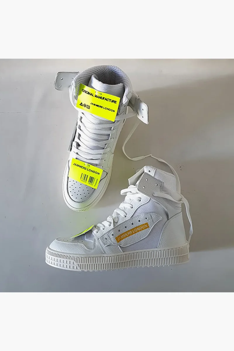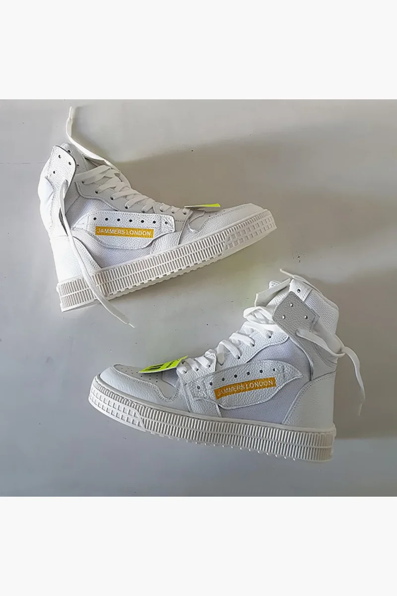 Sneakers in pelle bianco e in tessuto ape in bianco, stampa a caldo Jammers London, etichette in gommato fluo giallo e stampate, interni in spugna bianca, lacci bianchi sotto piede bianco. Calzata comoda, è consigliabile non prendere un numero in più, fondo in gomma bianca alta 3 cm. Calzature realizzate artigianalmente, rigorosamente made in Italy.