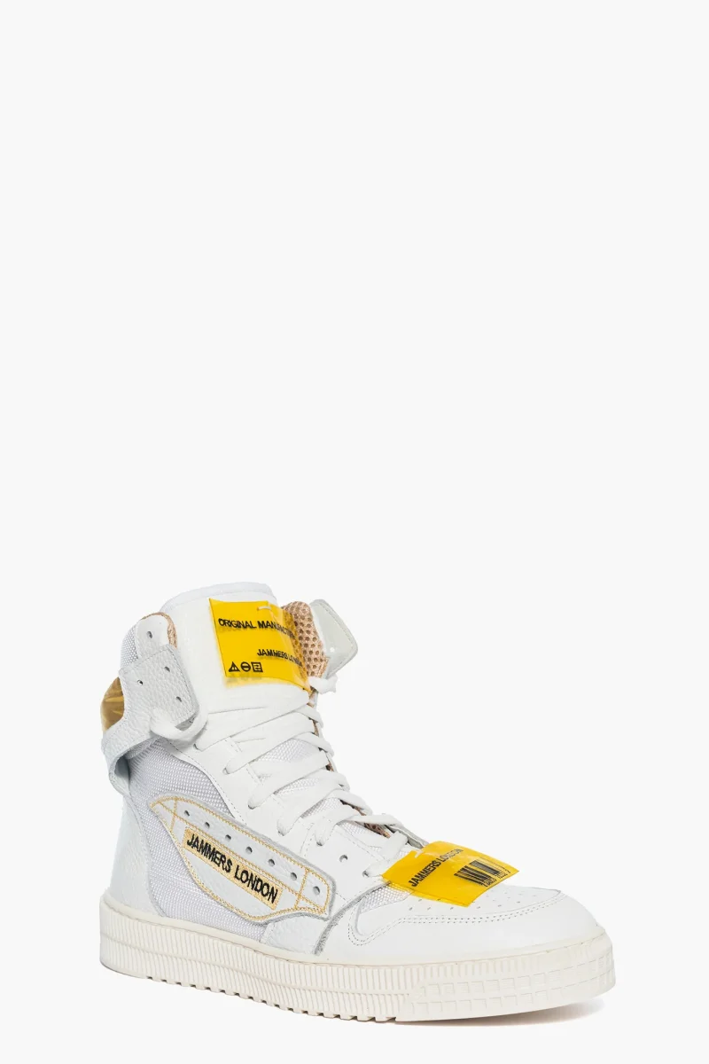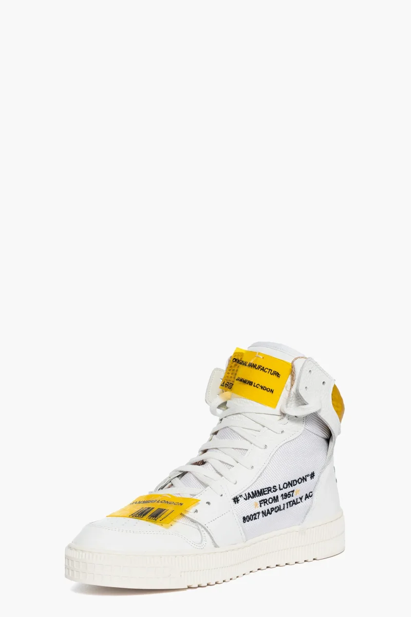 Sneakers in pelle bianca e in tessuto ape bianco. Ricamo ai lati Jammers London, in nero e giallo e etichette applicate in pvc giallo stampato. Interni in spugna gialla e sottopiede bianco. Lacci bianchi e riporto dietro alla caviglia in tecnico laminato giallo. Scritta ricamata nella parte interna e ricamo al tallone ad indicare il numero delle calzature. Calzano regolare, fondo in gomma bianca alta 3 cm. Calzature realizzate artigianalmente, rigorosamente made in Italy. Collezione Jammers London per Lia Diva.