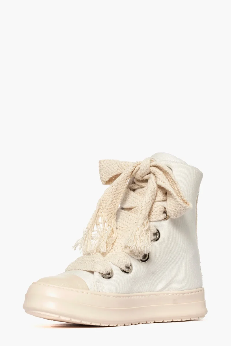 Sneakers in jeans bianco con occhielli in argento, punta in gommato beige, suola in gomma beige, altezza 3, laccio doppio beige, interni in spugna beige. Calzano comodi, realizzati in modo artigianale, made in Italy.