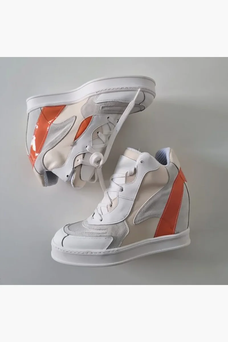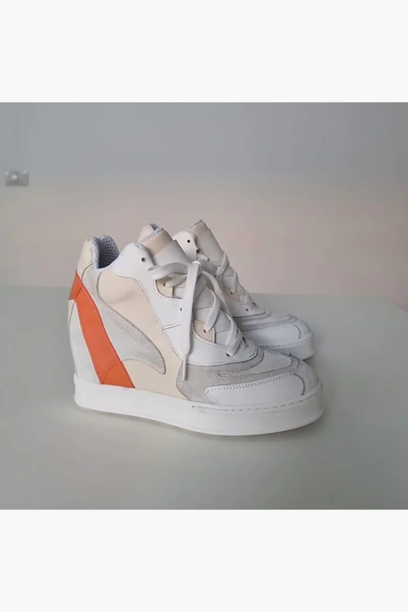 Sneakers Upp Code 2 nella versione pelle bianca con riporti in camoscio ghiaccio, in pelle beige e pvc arancio. Interni in spugna bianca e lacci bianchi, altezza zeppa interna 10 cm. Calzata comoda, taglia italiana. Calzature realizzate artigianalmente, rigorosamente made in Italy.