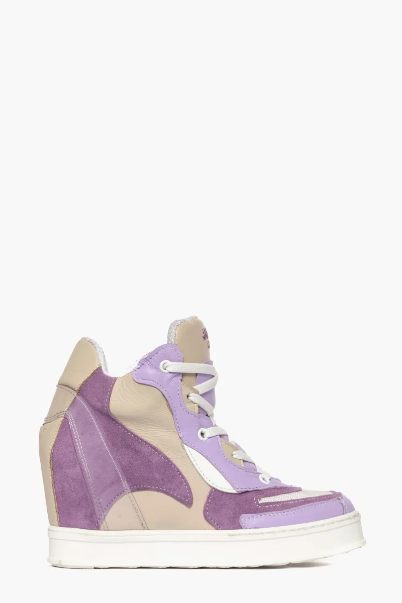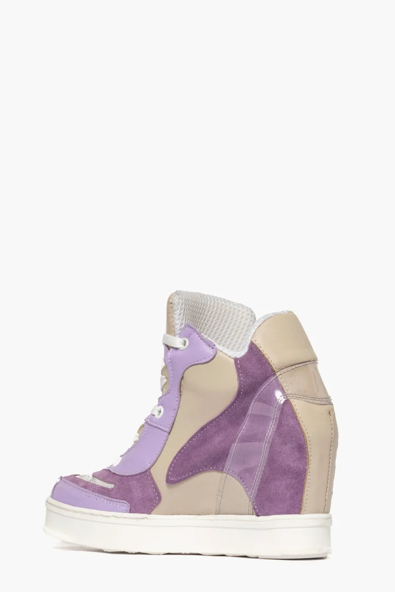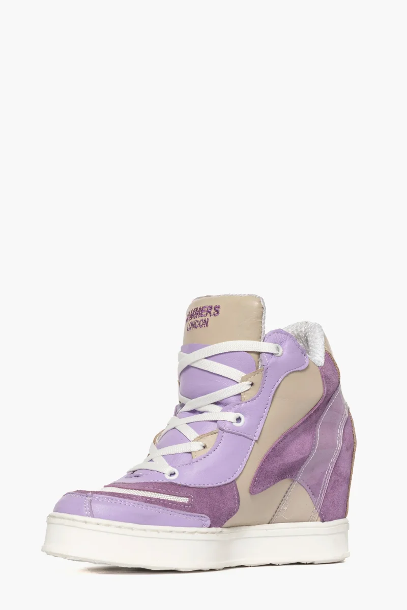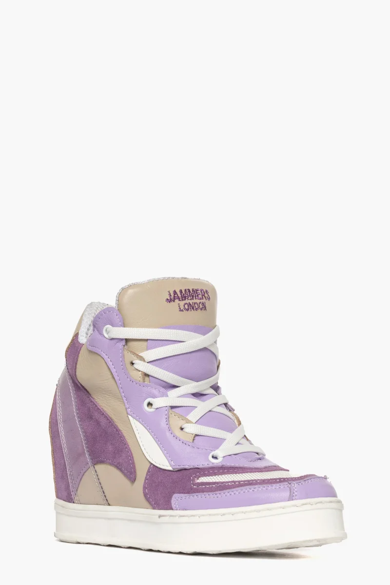Sneakers Upp Code 2 con zeppa interna, altezza 10 cm, in pelle glicine, tessuto ape e riporti in camoscio lilla e pelle beige, sul retro riporto in pvc trasparente, sulla linguetta ricamo nel colore glicine Jammers London, lacci bianchi, interni in spugna bianca, suola in gomma bianca. Calzata comoda, taglia italiana. Calzature realizzate artigianalmente, rigorosamente made in Italy.