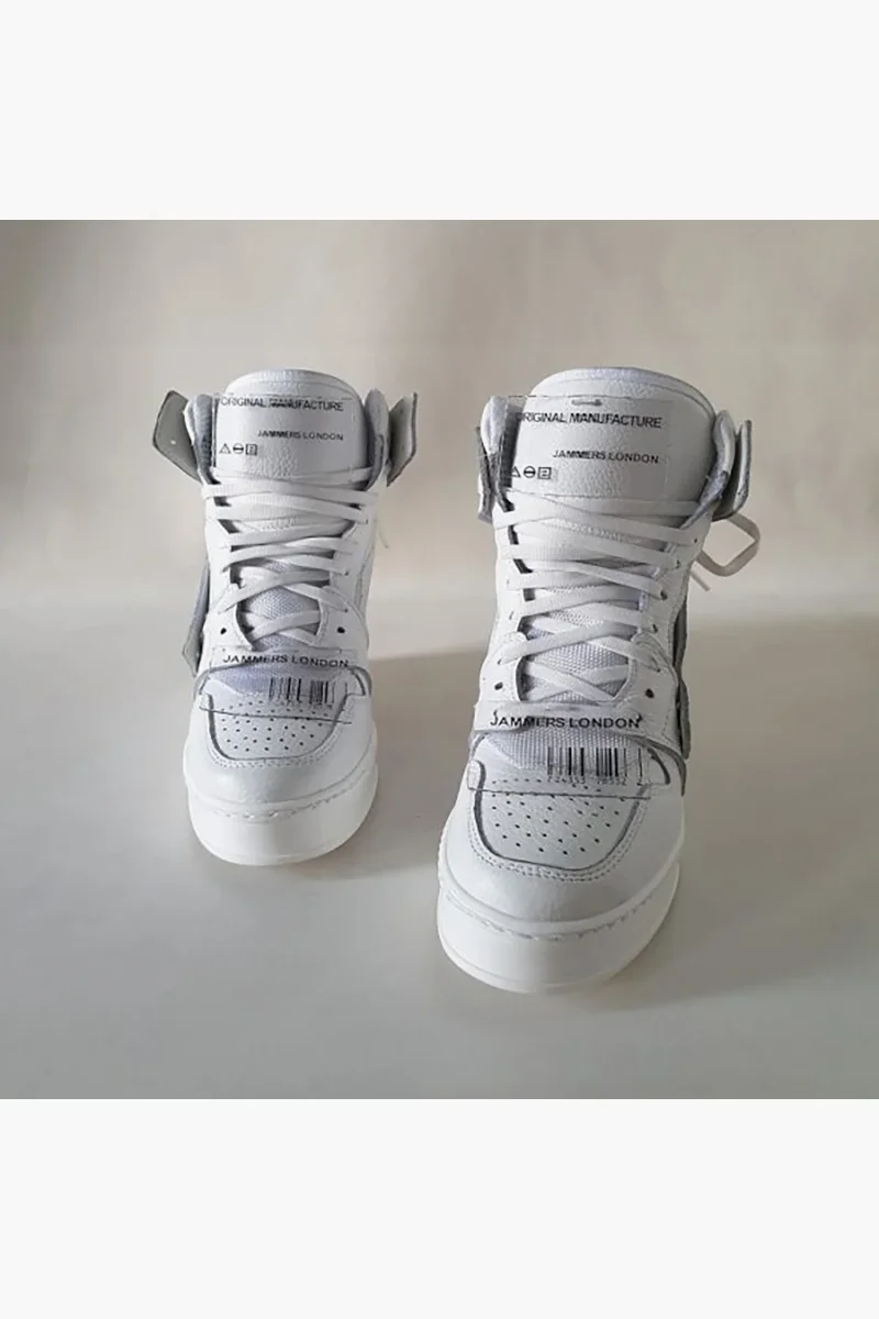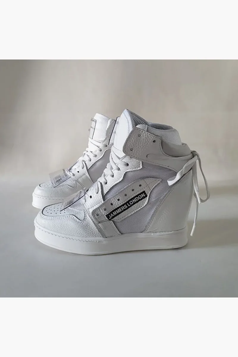 Sneakers in pelle bianca e tessuto ape bianco, stampa in nero Jammers London, etichetta trasparente e stampa nera, zeppa interna altezza 10 cm, lacci bianchi, fodera in spugna bianca, suola bianca in gomma. Calzature realizzate artigianalmente, rigorosamente made in Italy.