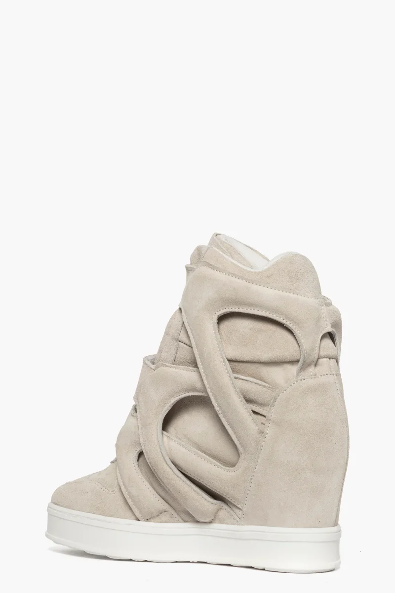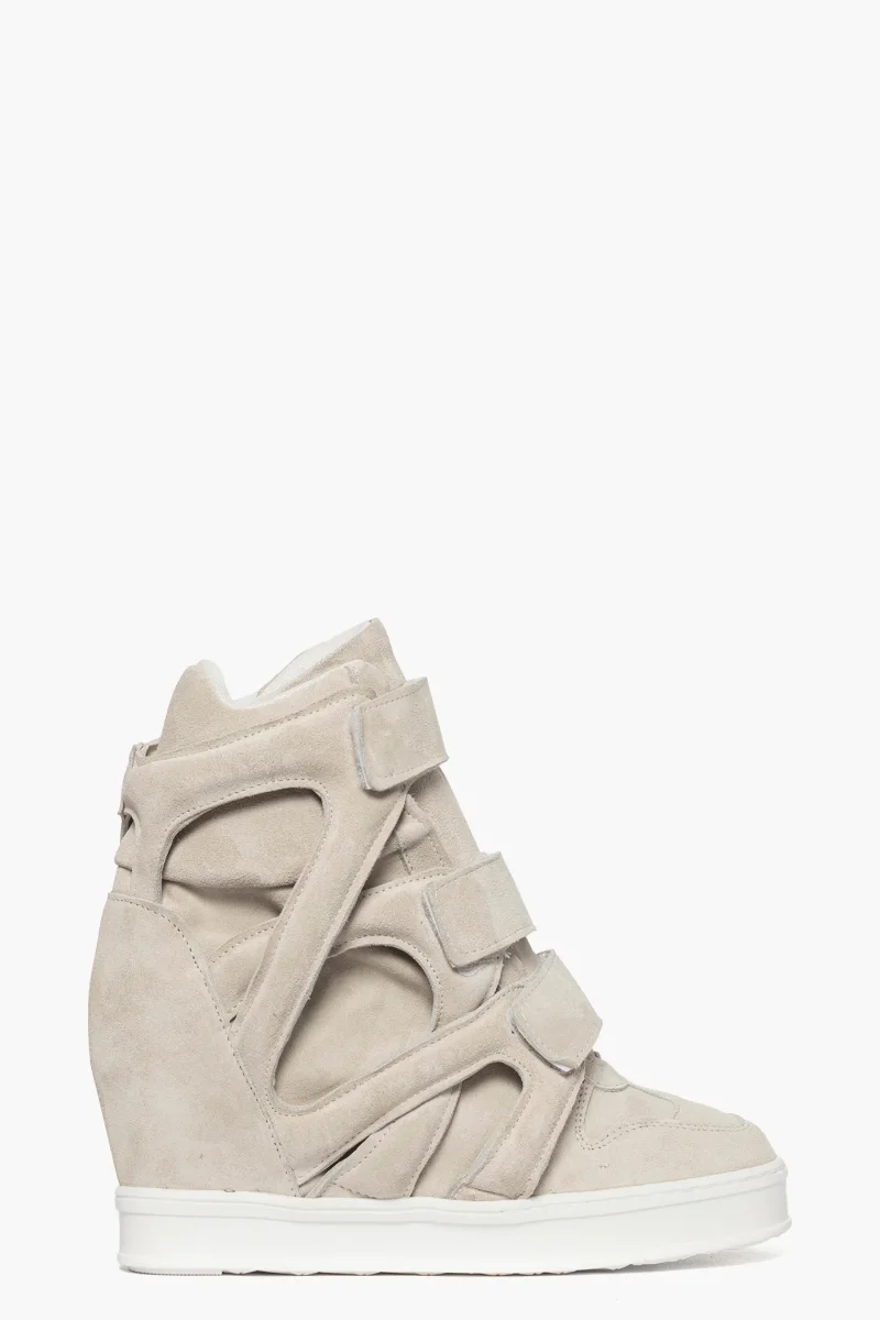 Sneakers in camoscio beige con tre strappi, altezza gambale 12cm, interno in spugna bianca, zeppa interna di 8. Calzano regolari. Calzature artigianali, made in italy.