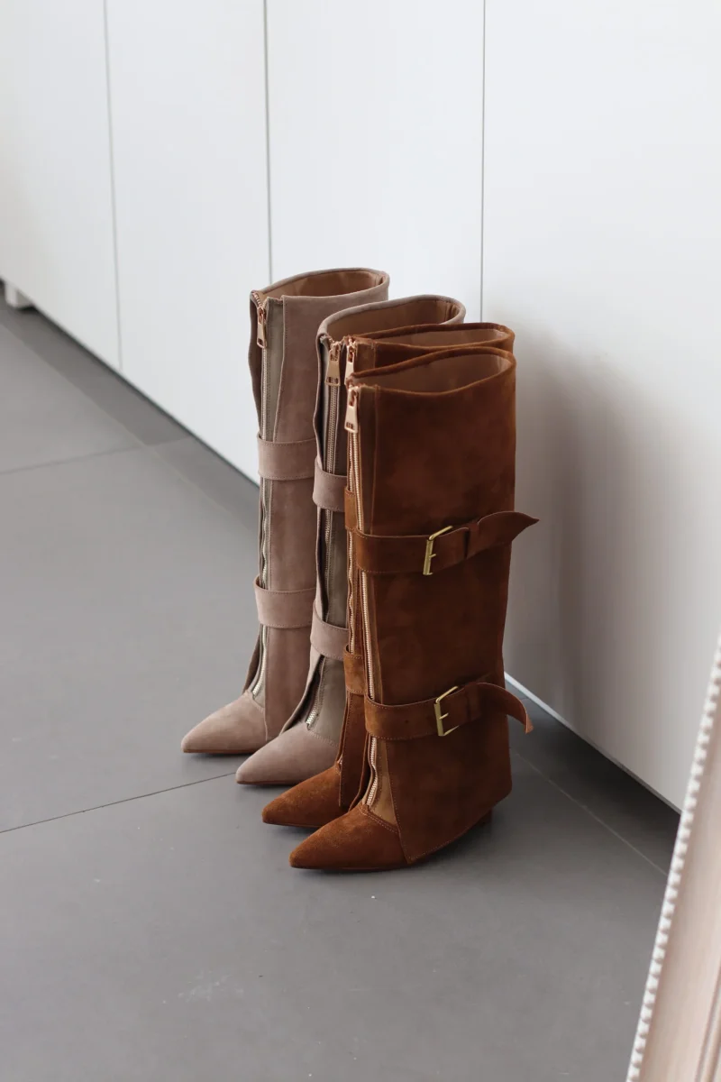 Stivale con cerniera frontale nel colore oro, in camoscio o pelle e riporto in jeans in tinta, zeppa rivestita, altezza 11, interni in similpelle, arriva sotto al ginocchio. Calzano regolari, calzature realizzate in modo artigianale, rigorosamente made in Italy.
