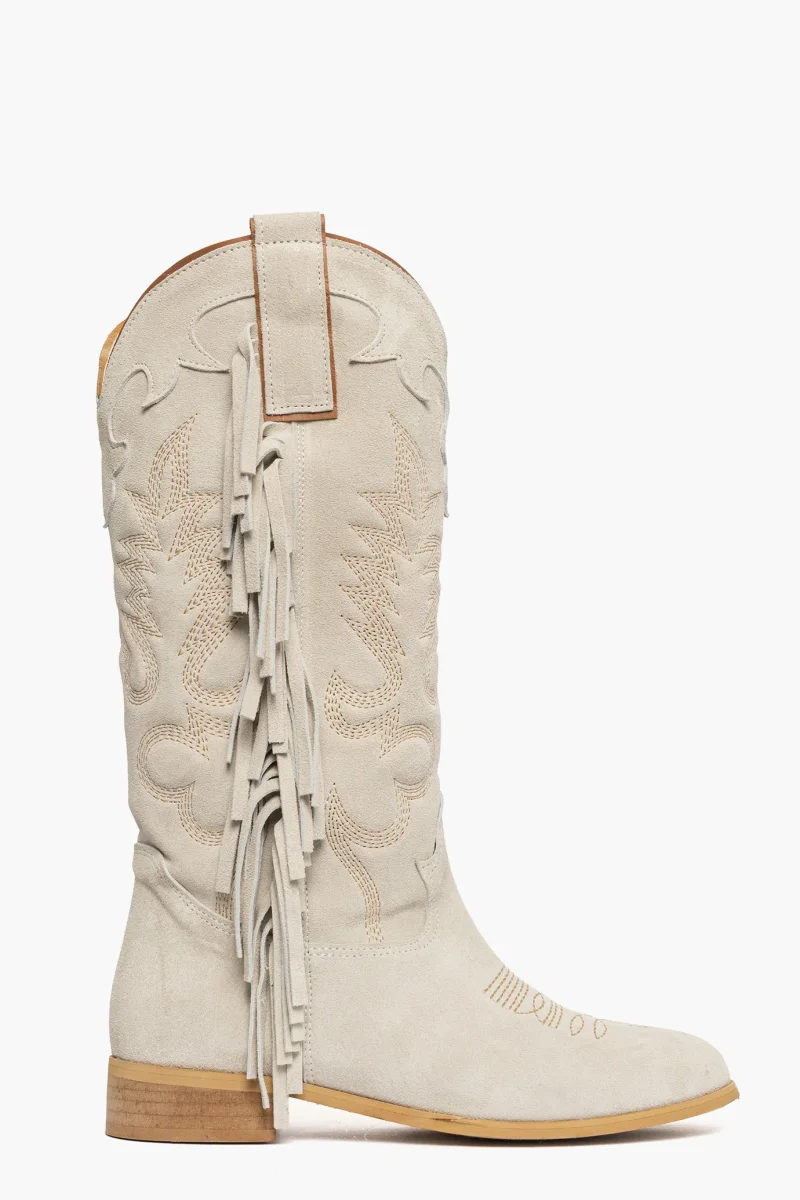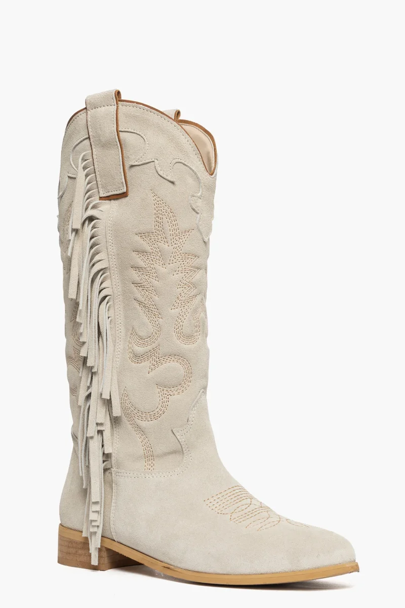 Stivale in camoscio beige con frange e particolare ricamo lungo il gambale e in punta, interni in similpelle, privo di cerniera, punta tonda, forma tecsana, suola nel colore neutro spazzolato, altezza 3. Calzano regolari, calzature artigianali, made in Italy.