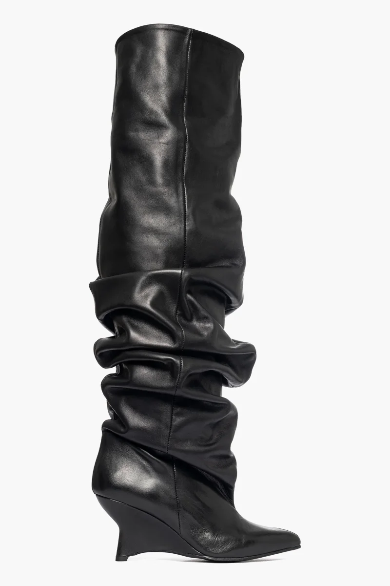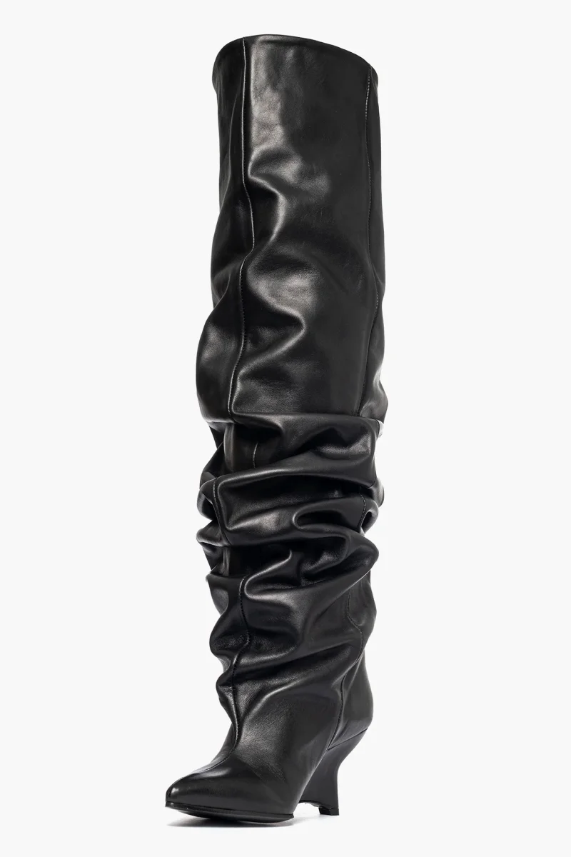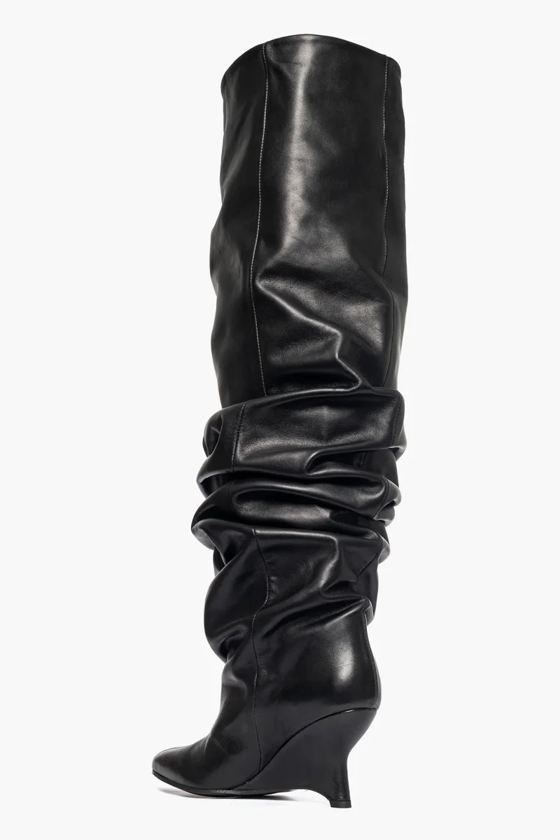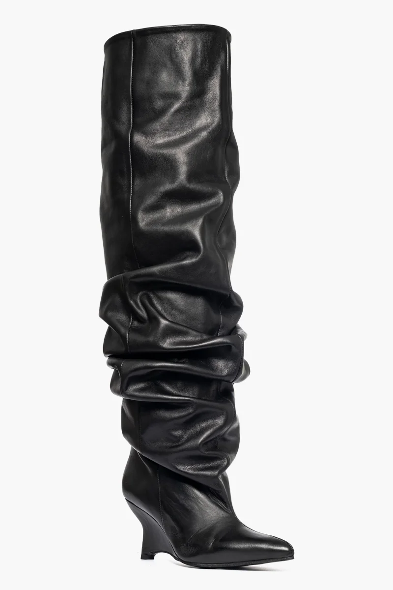 Stivale sopra al ginocchio aggrappato in pelle nero , con zeppa rivestita, altezza 8, interni in similpelle, punta leggermente stretta in avanti. Calzature artigianali, made in Italy.