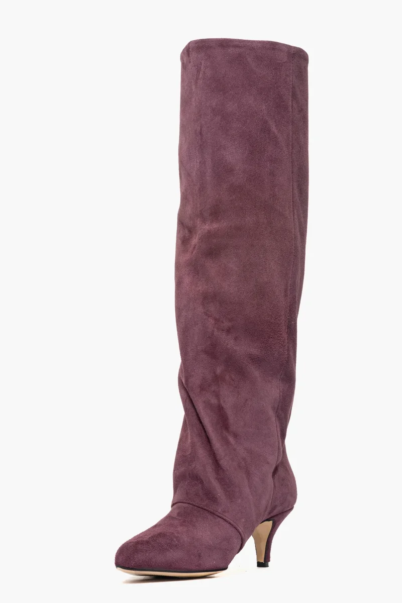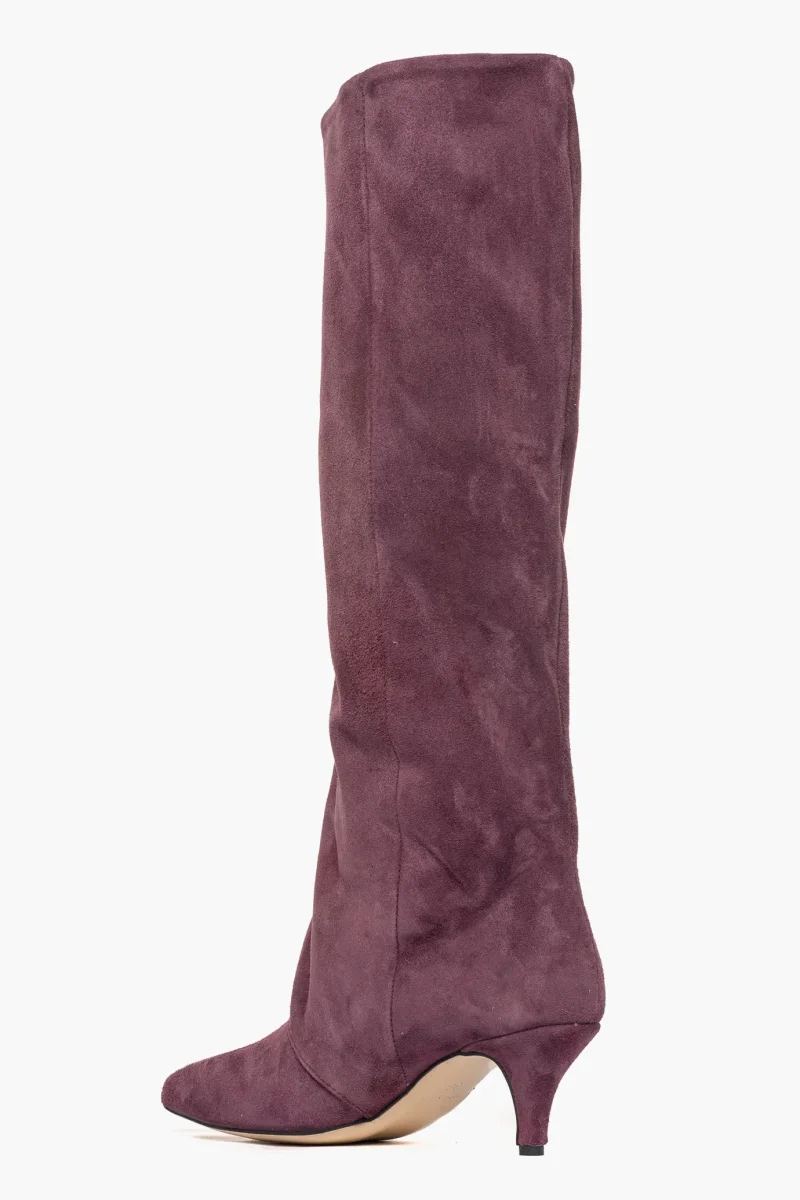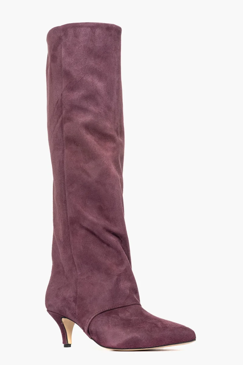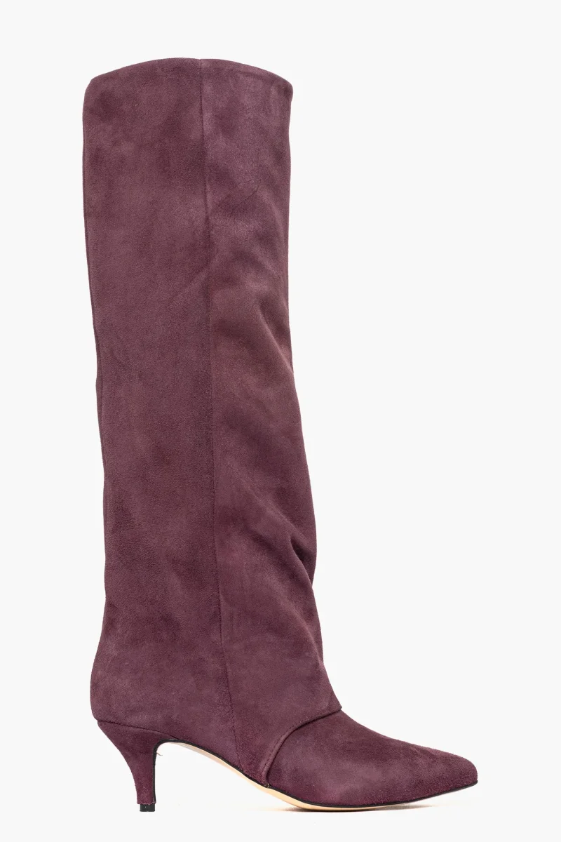 Stivale in camoscio amaranto, leggermente aggrappato in avanti, interni e sottopiede in similpelle, privo di cerniera, tacco rivestito, altezza 6. Calzata giusta, punta stretta. Calzature realizzate in modo artigianale, rigorosamente Made in Italy.