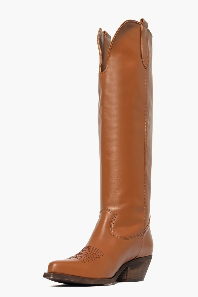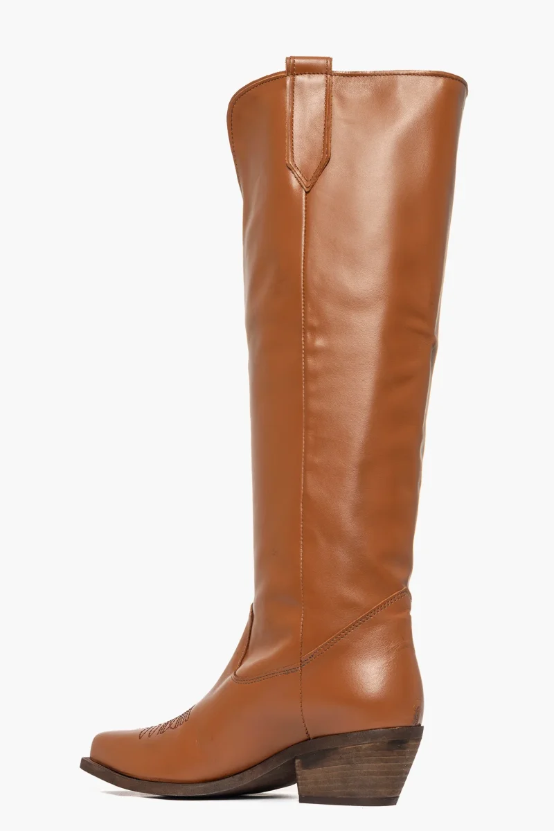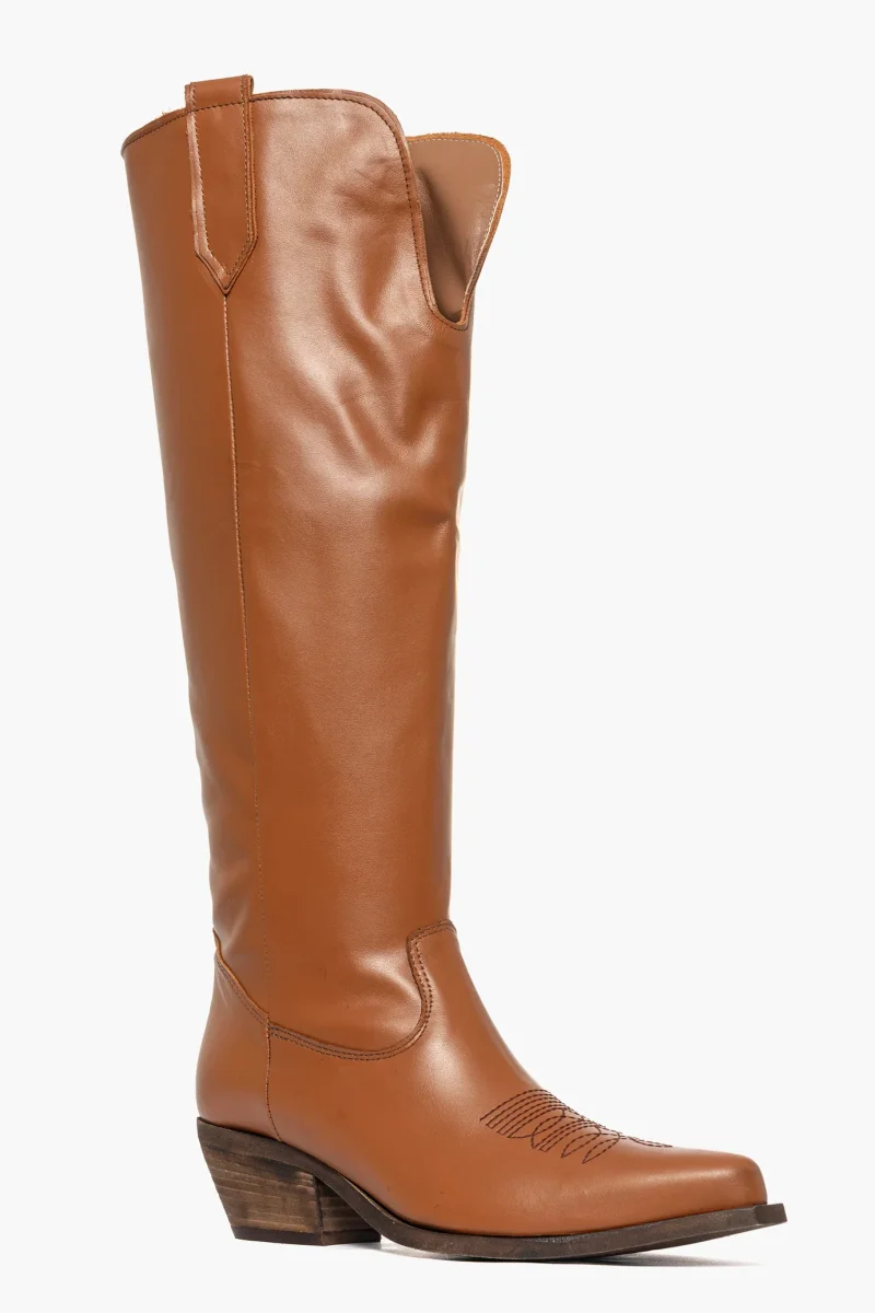 Stivale al ginocchio in pelle cuoio, con ricamo in punta, della linea texana Oldwest, interni in similpelle, suola in micro neutro spazzolata, altezza 5. Calzano comodi, calzature artigianali, made in Italy.