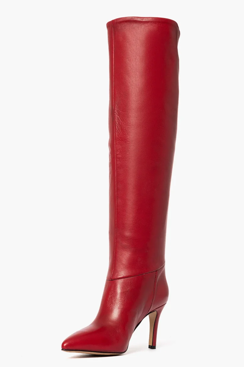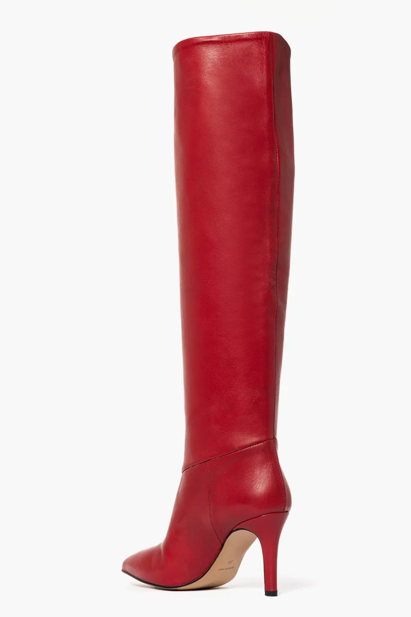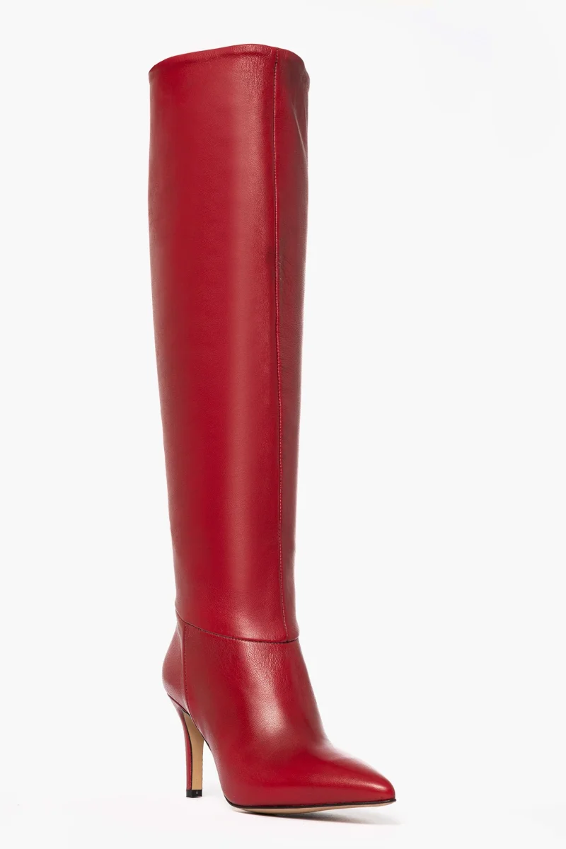 Stivali alti al ginocchio in pelle rossa. Interni e sottopiede in similpelle, privo di cerniera, tacco rivestito, altezza 8cm. Calzano giusti, punta stretta. Calzature artigianali, made in Italy.