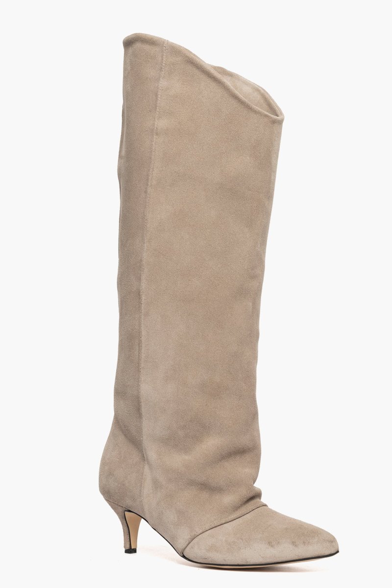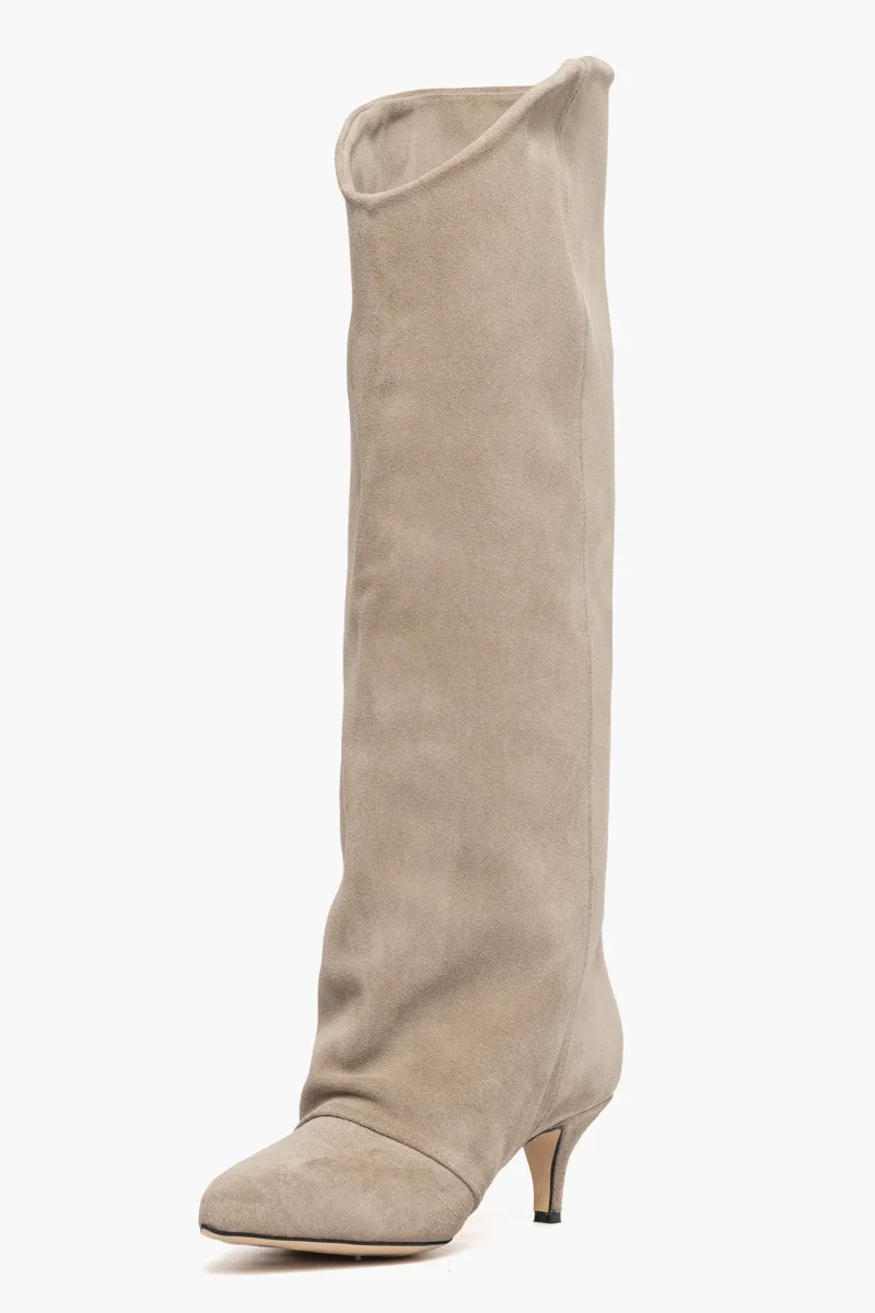 Stivale in camoscio taupè, interni in similpelle, tacco rivestito, 6, calzano regolari, punta in avanti, la versione alta della linea Angel, calzature artigianali, made in Italy.