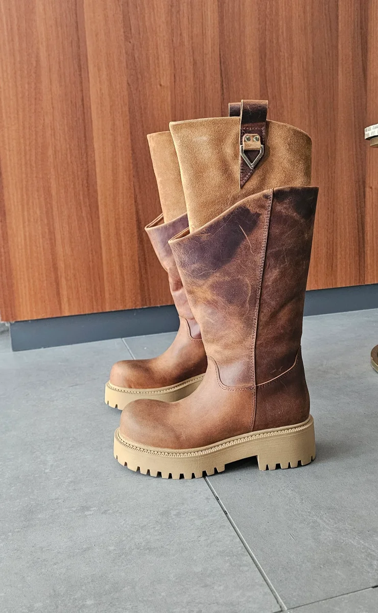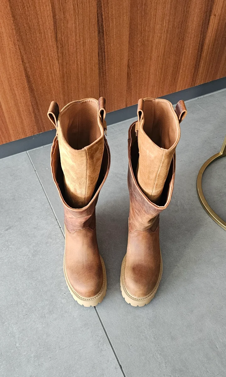Stivale in nabuk ingrassato spazzolato e riporto in camoscio cuoio , doppio gambale, con accessori ai lati nel colore oro, punta tonda della linea Boomerang, interni in similpelle, privo di cerniera, suola in gomma biscotto, altezza 5. Calzature artigianali, made in Italy.