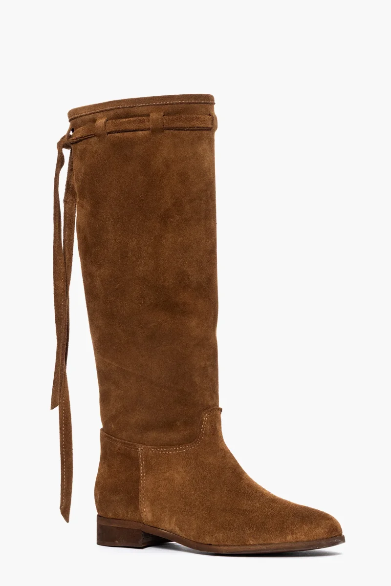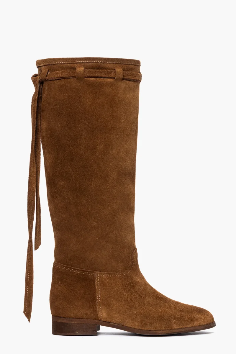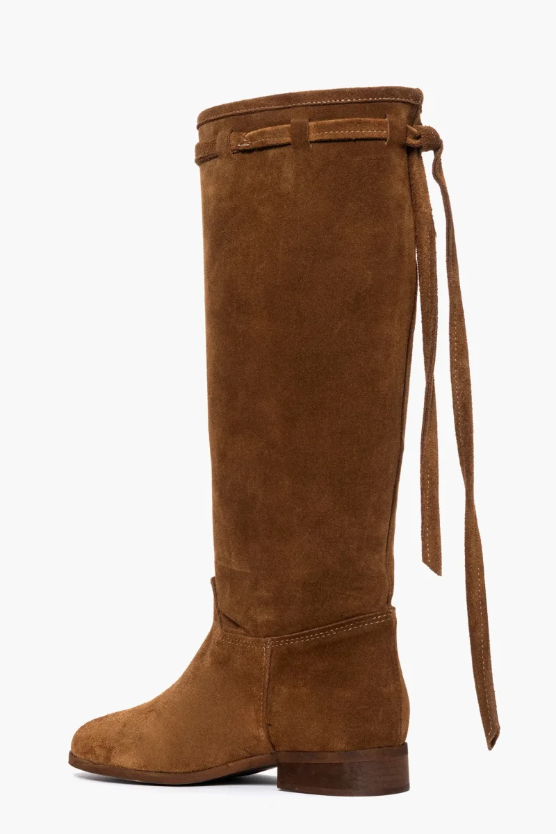 Stivali in camoscio cuoio con laccio sulla parte alta, che avvolto e possibile fare un nodo, privo di cerniera, calzano regolari, altezza 3.