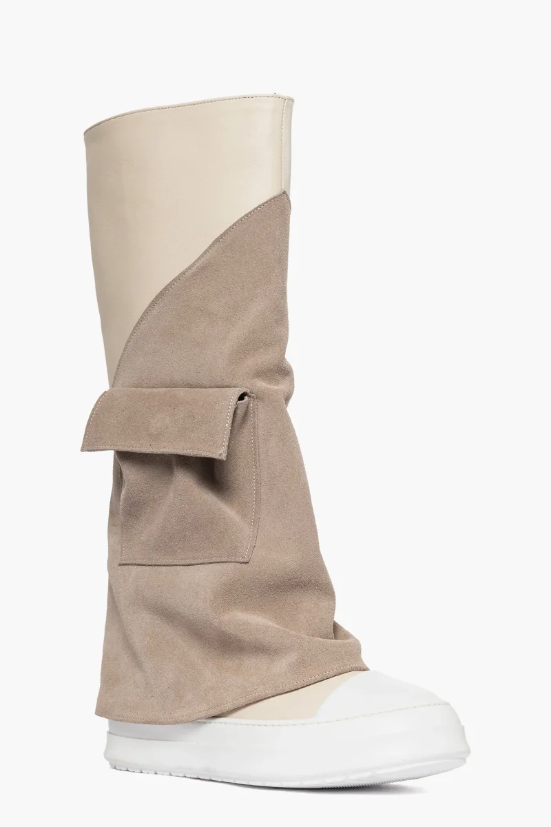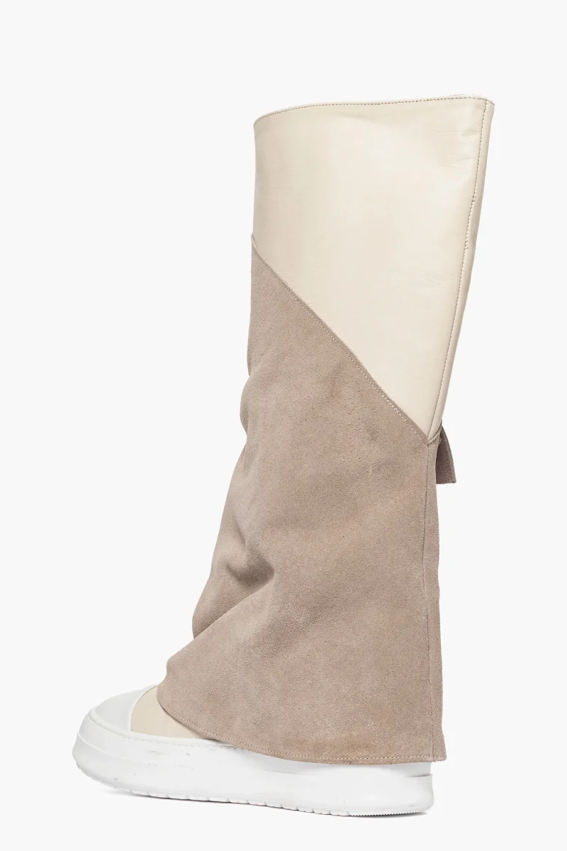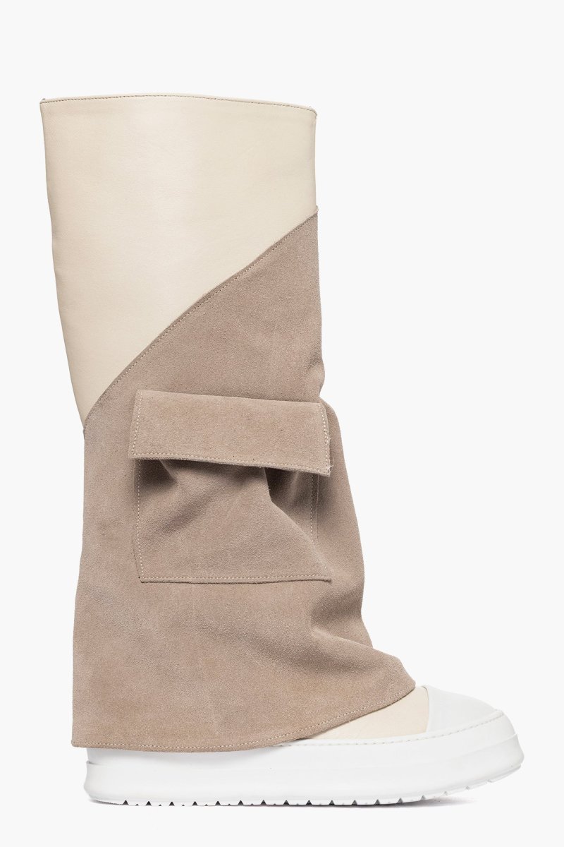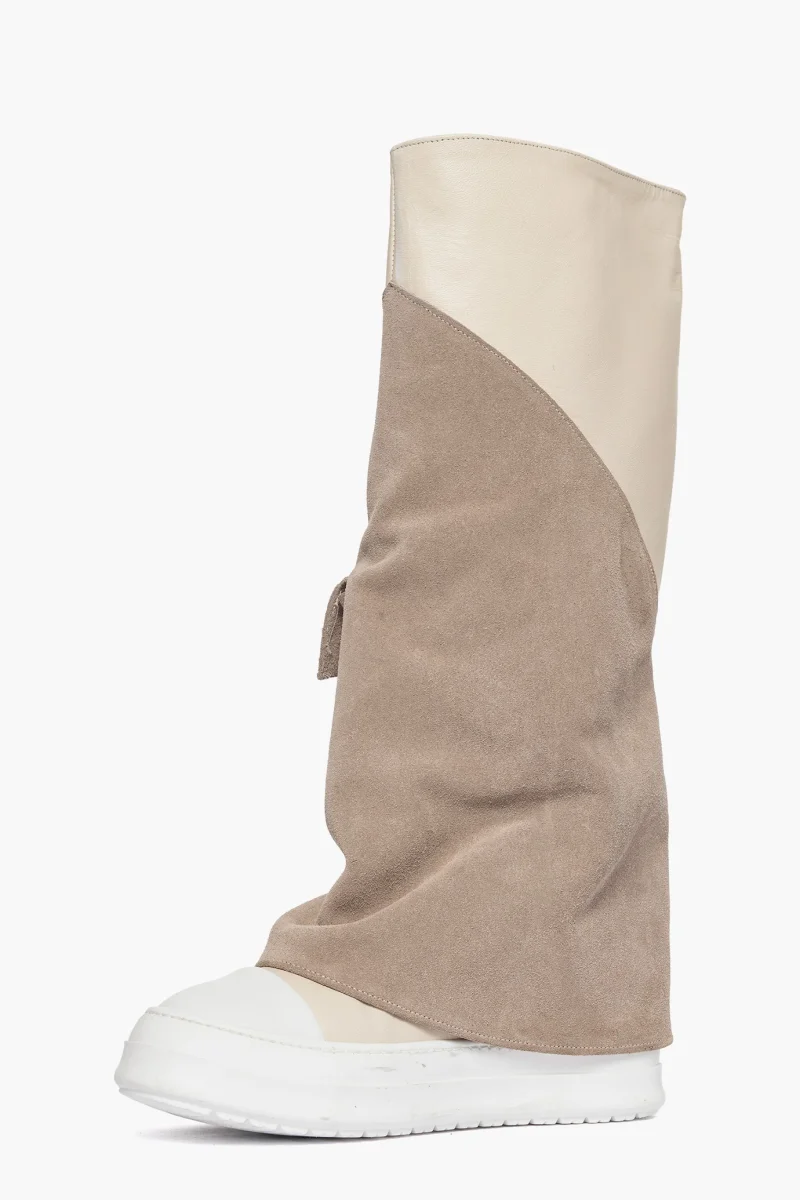 Stivale in camoscio taupè e riporto in pelle beige con punta in gommato bianco, interni in similpelle, tasca funzionale esterno piede, suola bianca in gomma, altezza 4. Calzano comode, calzature artigianali, made in Italy.