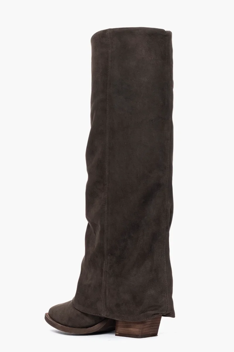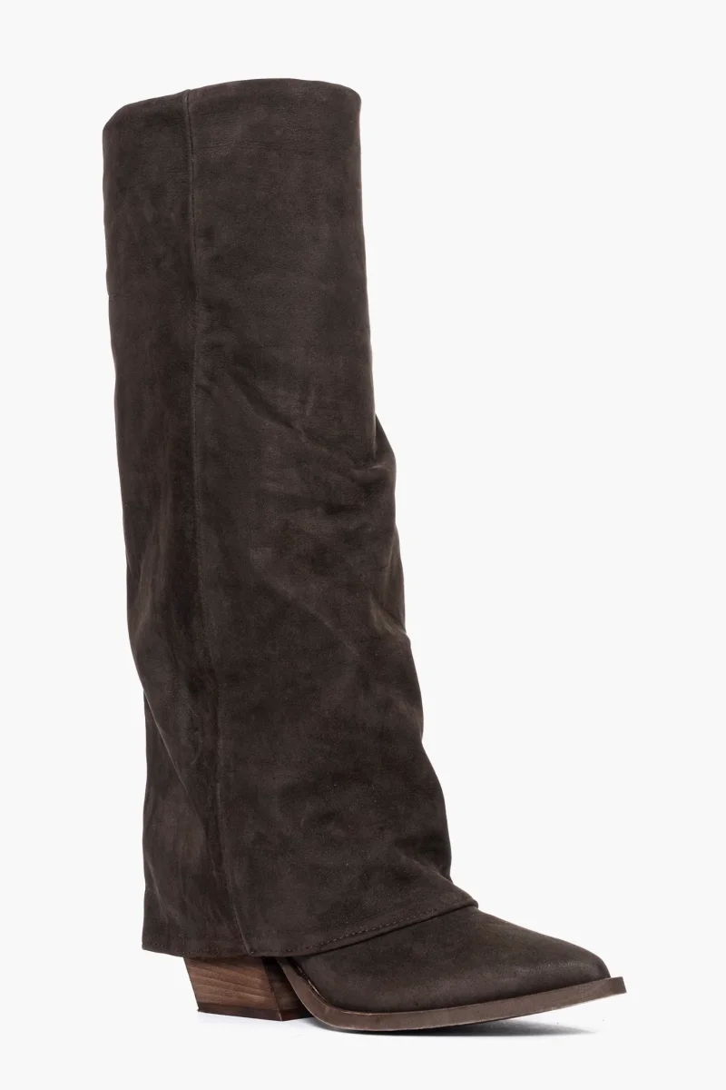 Stivale in camoscio testa di moro con risvolto aggrappato, interni in similpelle, suola neutra spazzolata, tacco 7, calzano giuste punta stretta, forma texana, calzature artigianali, made in Italy.