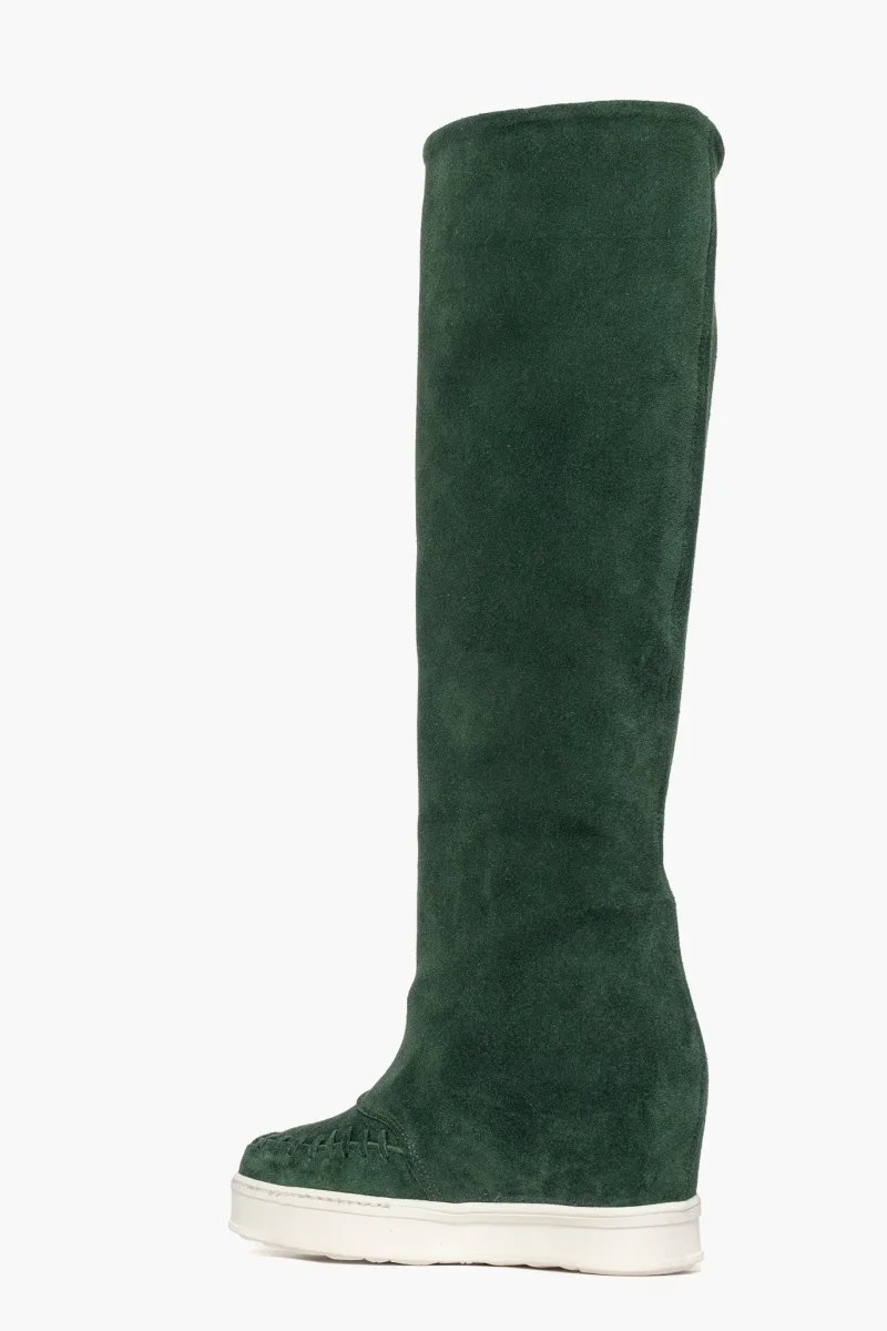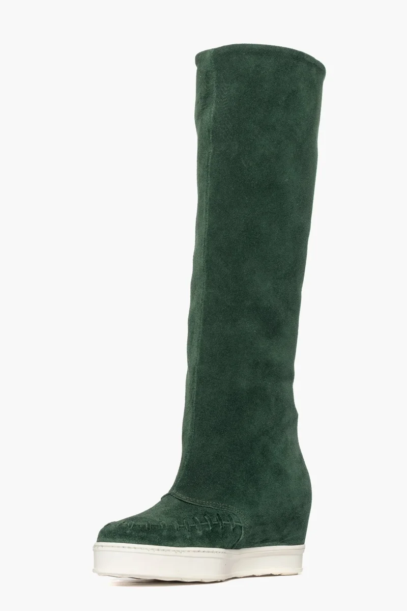 Stivale in camoscio verde, possibile risvoltare lo stivale, con infilatura a mano lungo il bordo della punta, comodo rialzo interno, suola in gomma bianca, altezza 9/10. Calzano regolari.