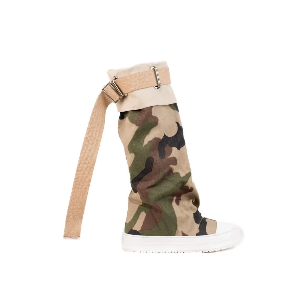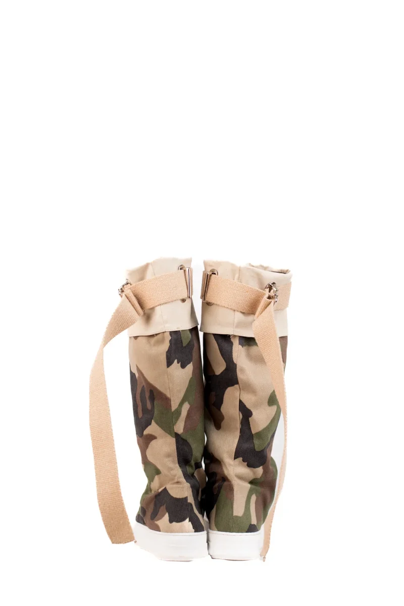 Stivale in denim camouflage e riporto in camoscio beige, con cintura regolabile, punta in gommato bianco, suola bianca, altezza 4. Calzano regolari, punta tonda, privo di cerniera. Calzature artigianali, made in Italy.