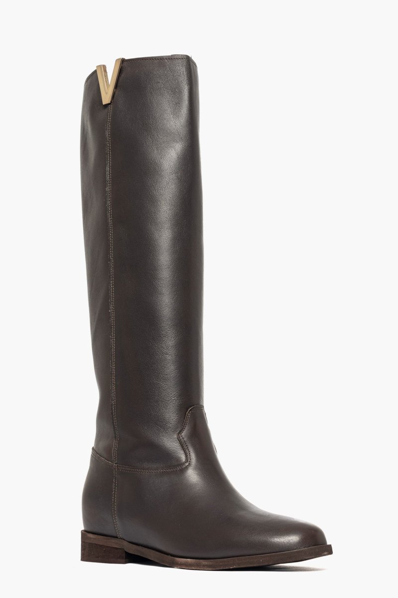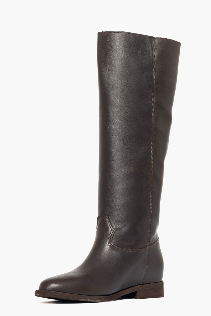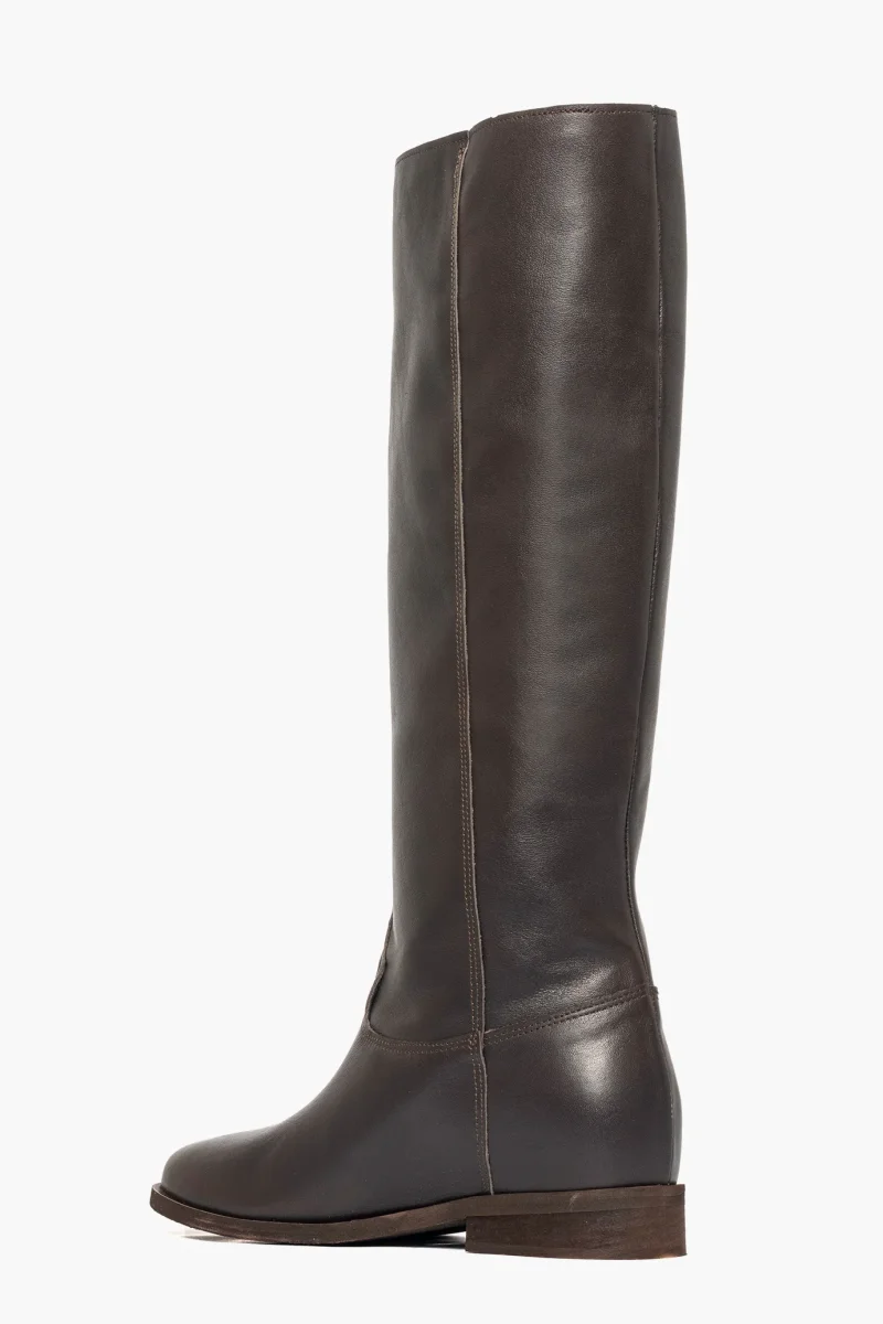 Stivali al ginocchio pelle testa di moro con rialzo, altezza totale 8, accessorio nel colore oro, interni e sottopiede in similpelle , punta tonda . Calzano regolari. Calzature artigianali, made in Italy.
