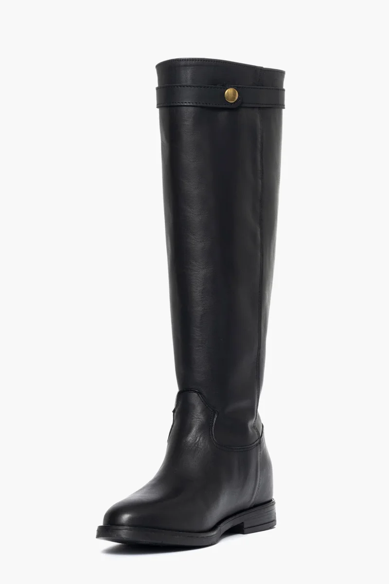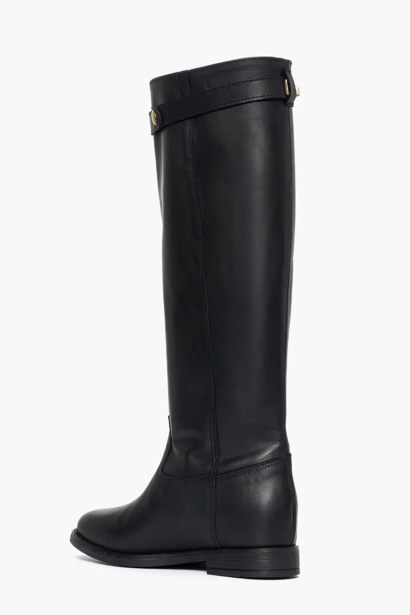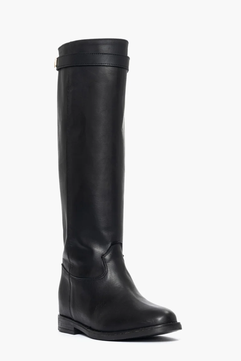 Stivale con rialzo interno in pelle nero, cintura estraibile con accessorio nel colore oro, rialzo interno 3, totale 6/7, interni in similpelle. Calzano regolari, punta tonda in avanti. Calzature artigianali, made in Italy.