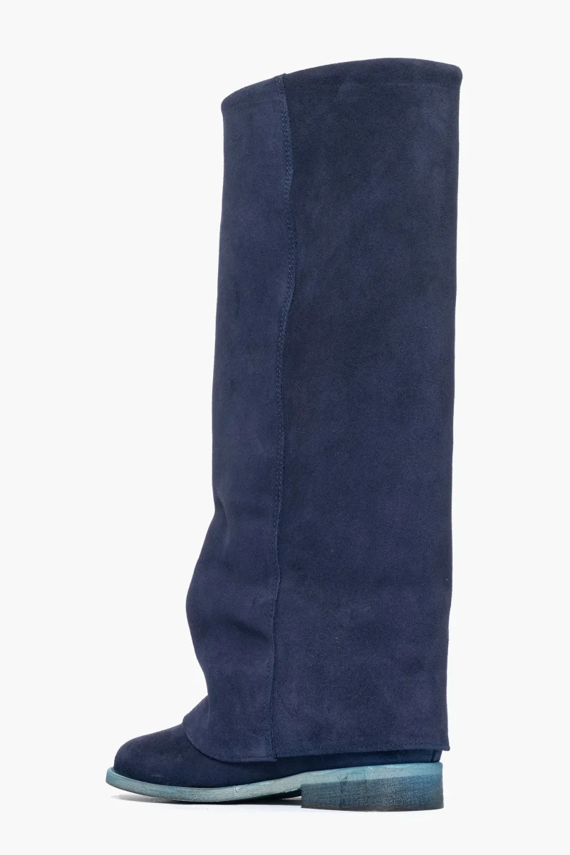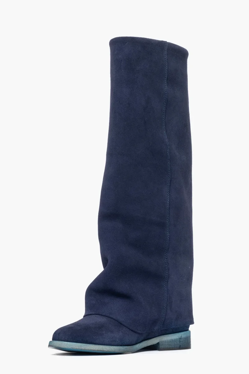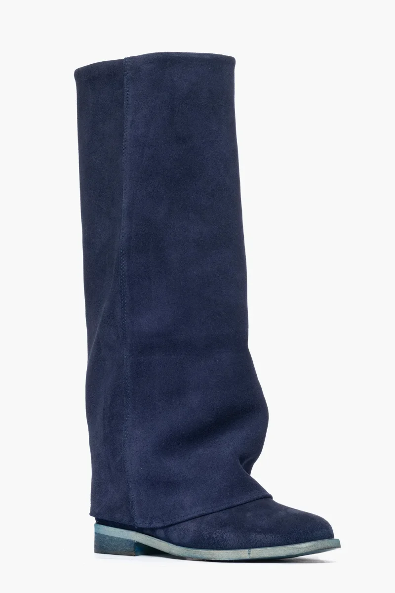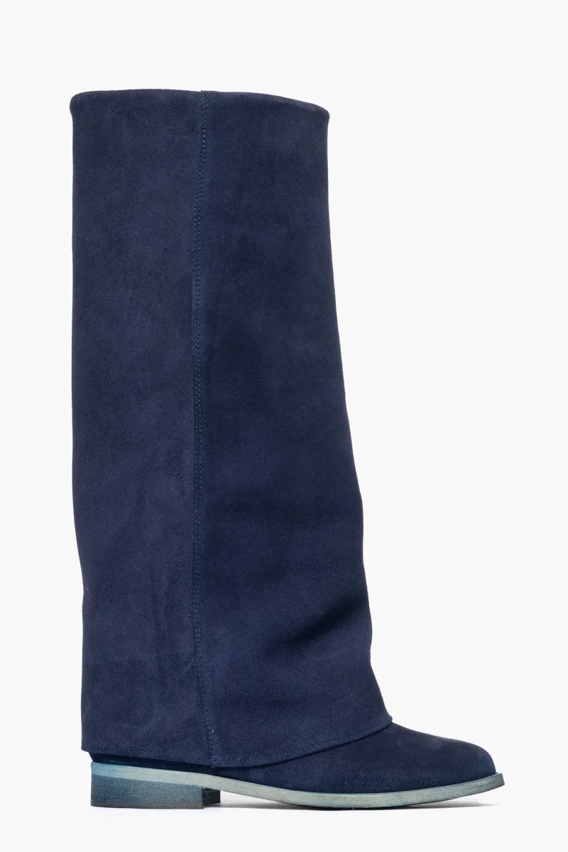 Stivale con rialzo e risvolto in camoscio blu, altezza 8, interni e sottopiede in similpelle, calzano regolari, punta tonda. Calzature artigianali, made in Italy.