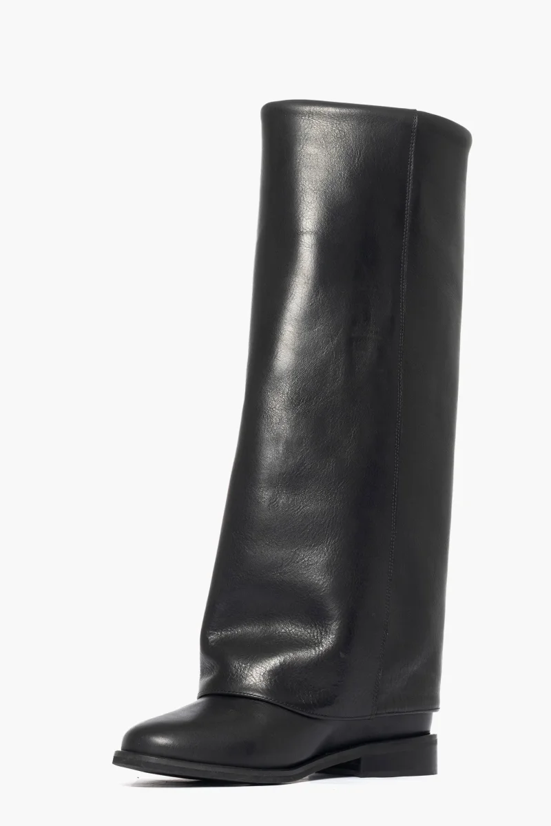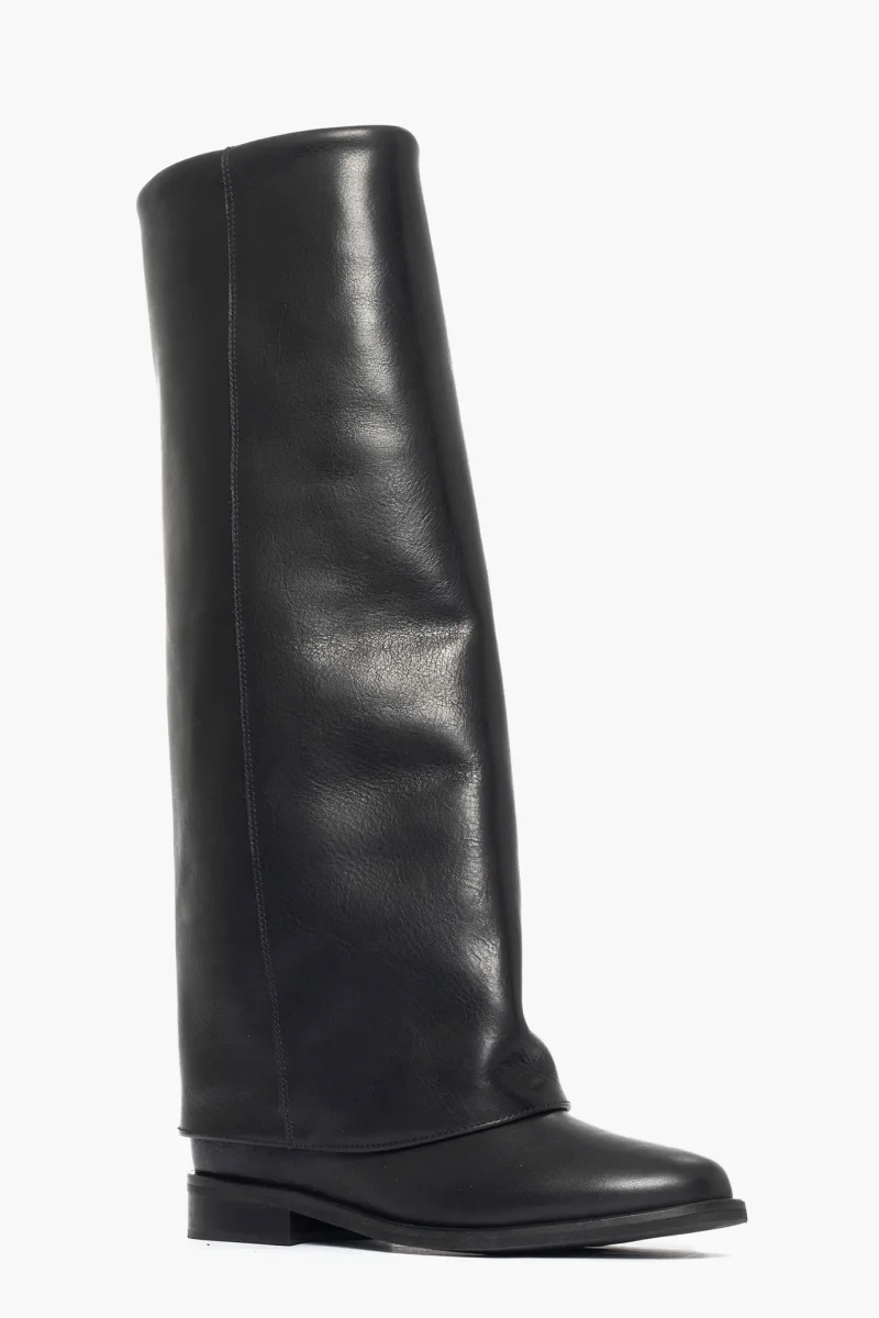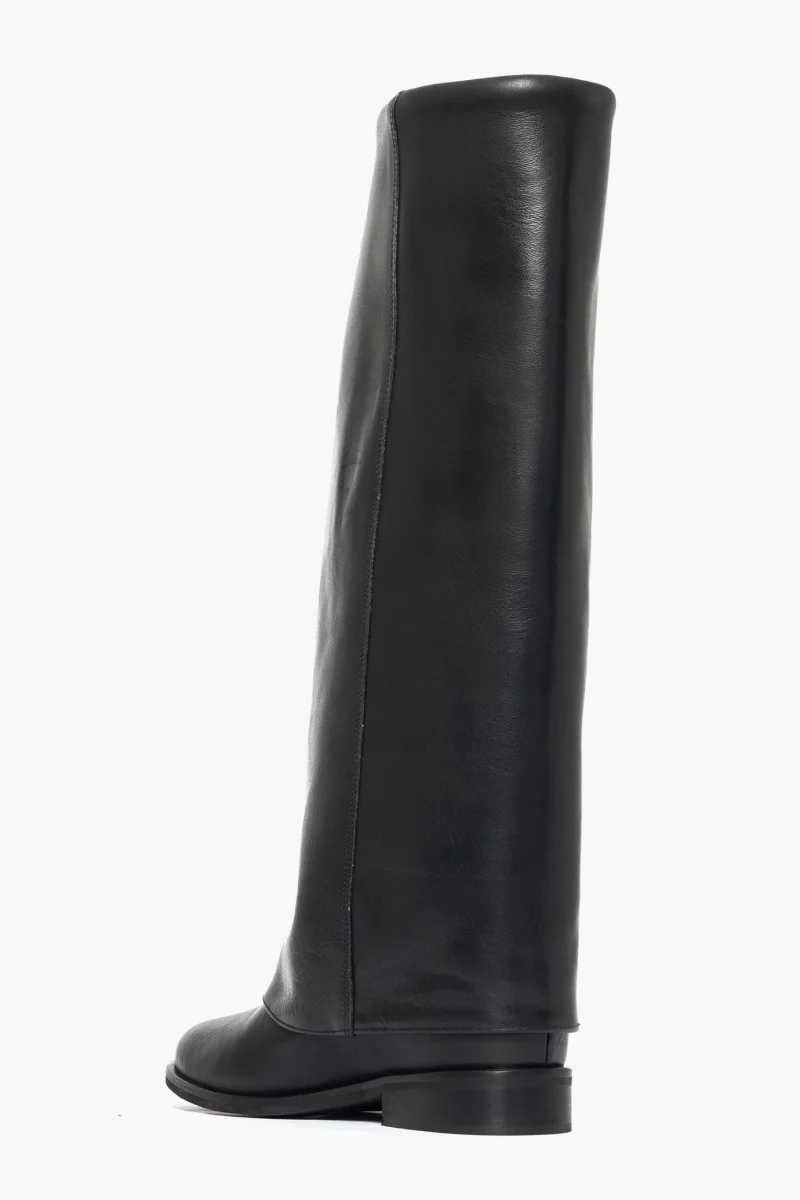 Stivale con rialzo e risvolto in pelle nero, altezza 8, interni e sottopiede in similpelle, calzano regolari, punta tonda. Calzature artigianali, made in Italy.