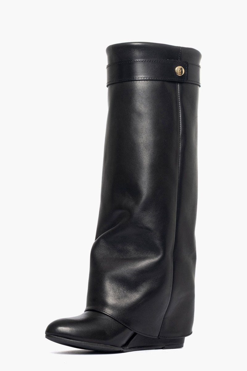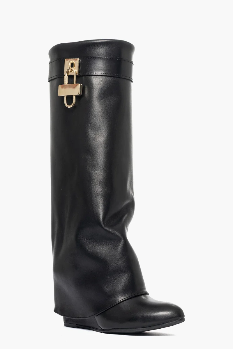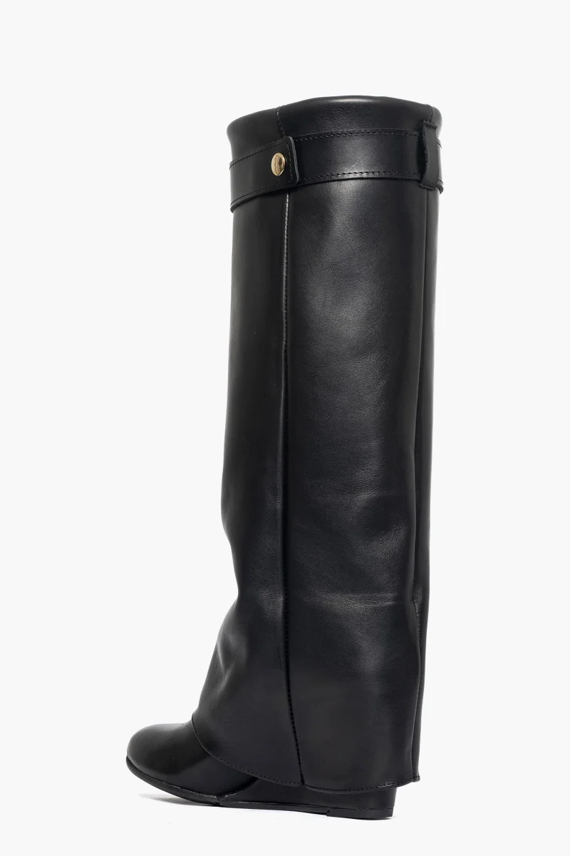 Stivale sotto al ginocchio con risvolto in pelle nero, rialzo esterno, zeppa rivestita, altezza 7. interni in similpelle, cintura con accessorio nel colore oro. Calzano regolari, calzature artigianali, made in Italy.