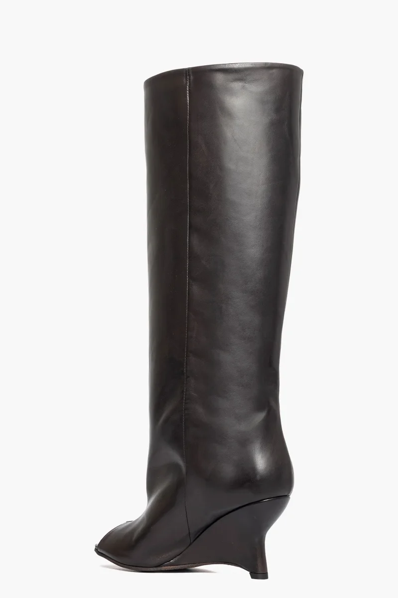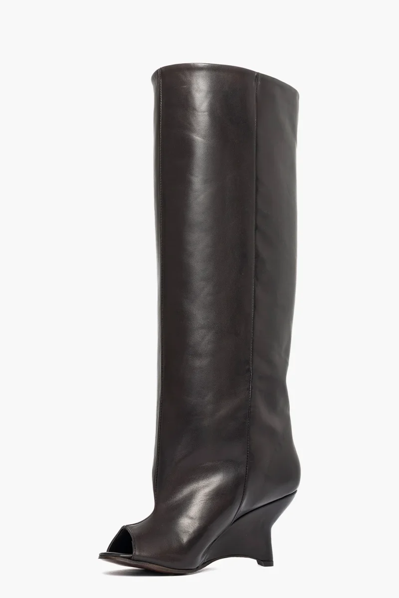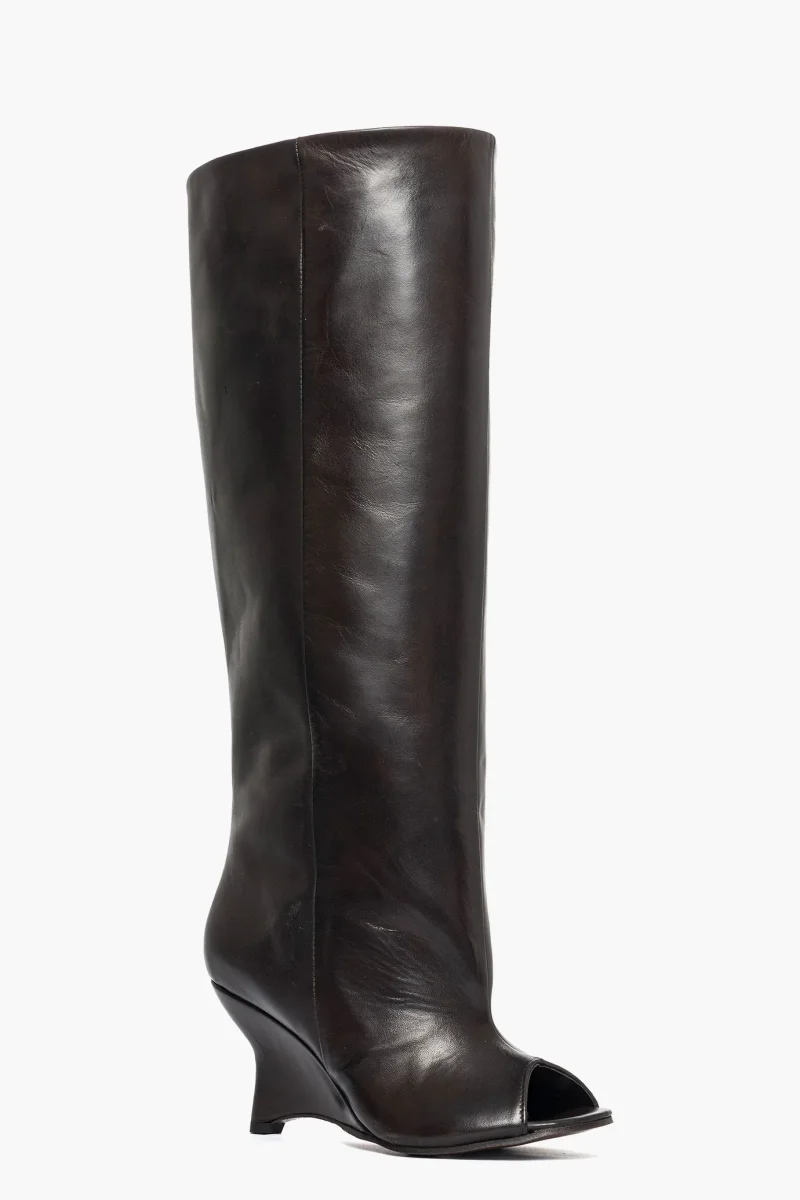 Stivale con gambale ampio circa 46/48 cm in pelle nero, punta aperta, al ginocchio, privo di cerniera, con zeppa rivestita, altezza 8.5. Calzano regolari, punta tonda. Calzature artigianali, made in Italy.